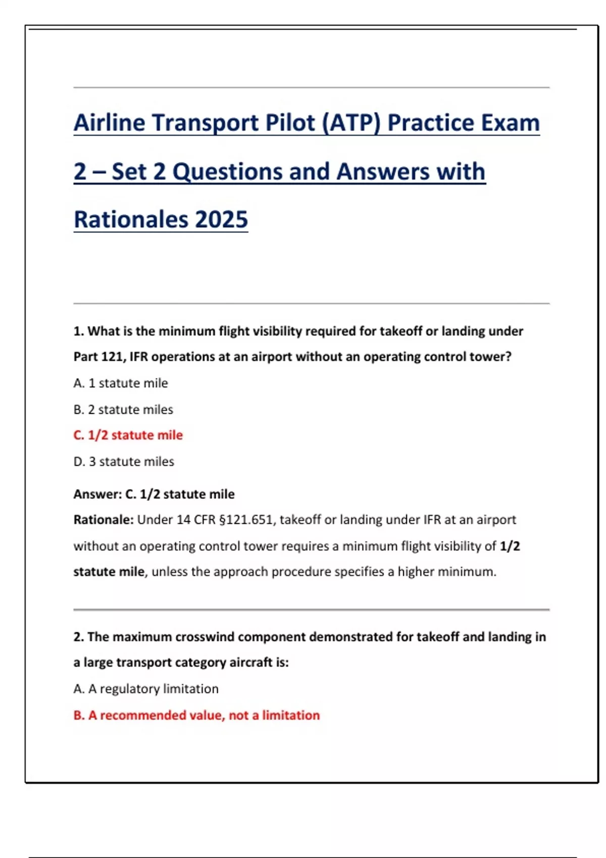 Airline Transport Pilot (ATP) Practice Exam 2 – Set 2 Questions and Answers with Rationales 2025