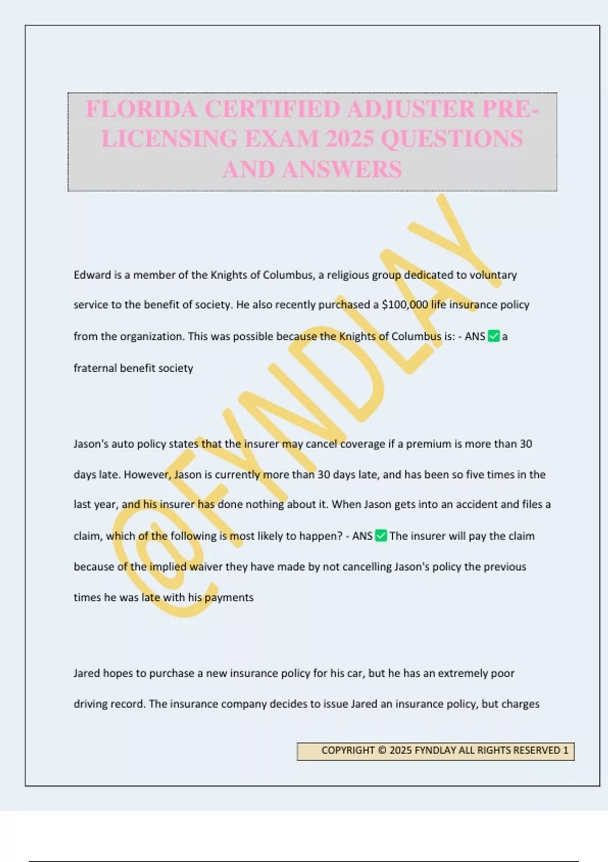FLORIDA CERTIFIED ADJUSTER PRE- LICENSING EXAM 2025 QUESTIONS AND ANSWERS