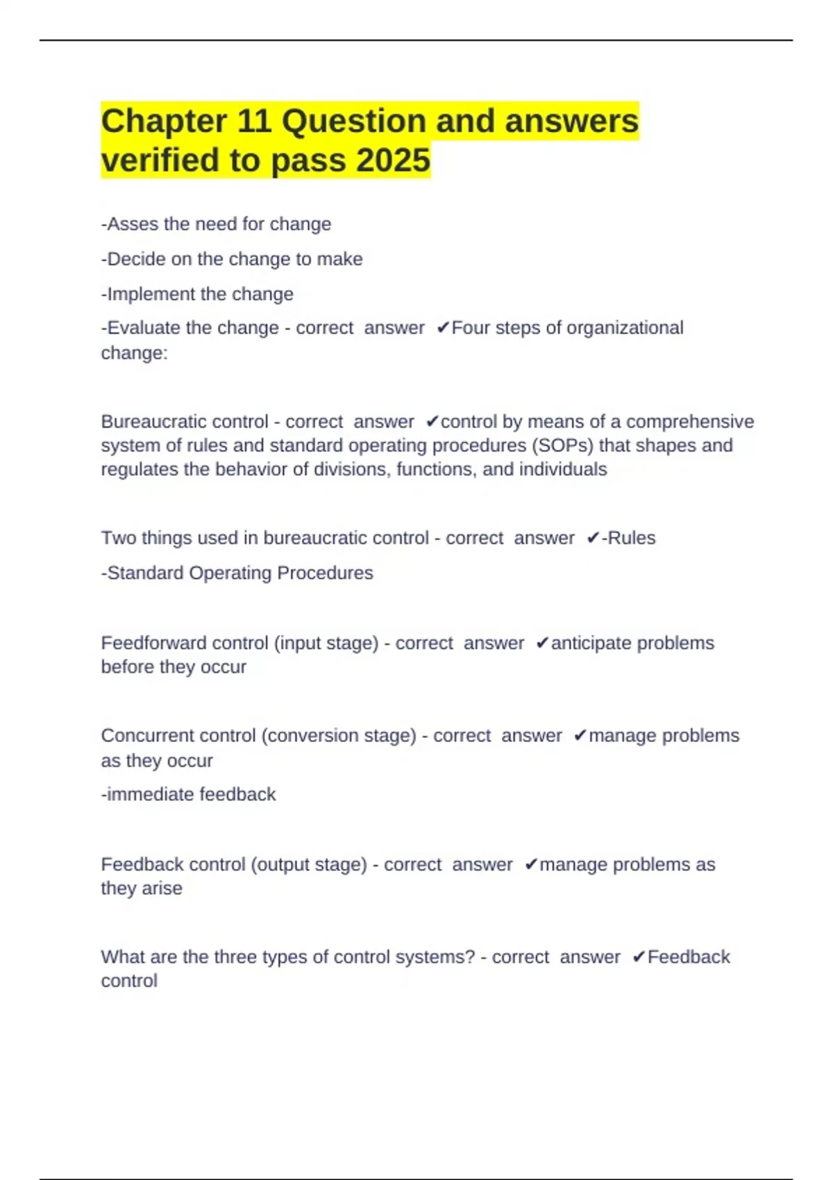Chapter 11 Question and answers verified to pass 2025 -Asses the need for change -Decide on the change to make -Implement the change -Evaluate the change - correct answer Four steps of organizational change: Bureaucratic control - correct answer control by means of a comprehensive system of rules and standard operating procedures (SOPs) that shapes and regulates the behavior of divisions, functions, and individuals Two things used in bureaucratic control - correct answer -Rules -Standard Operating Procedures Feedforward control (input stage) - correct answer anticipate problems before they occur Concurrent control (conversion stage) - correct answer manage problems as they occur -immediate feedback Feedback control (output stage) - correct answer manage problems as they arise What are the three