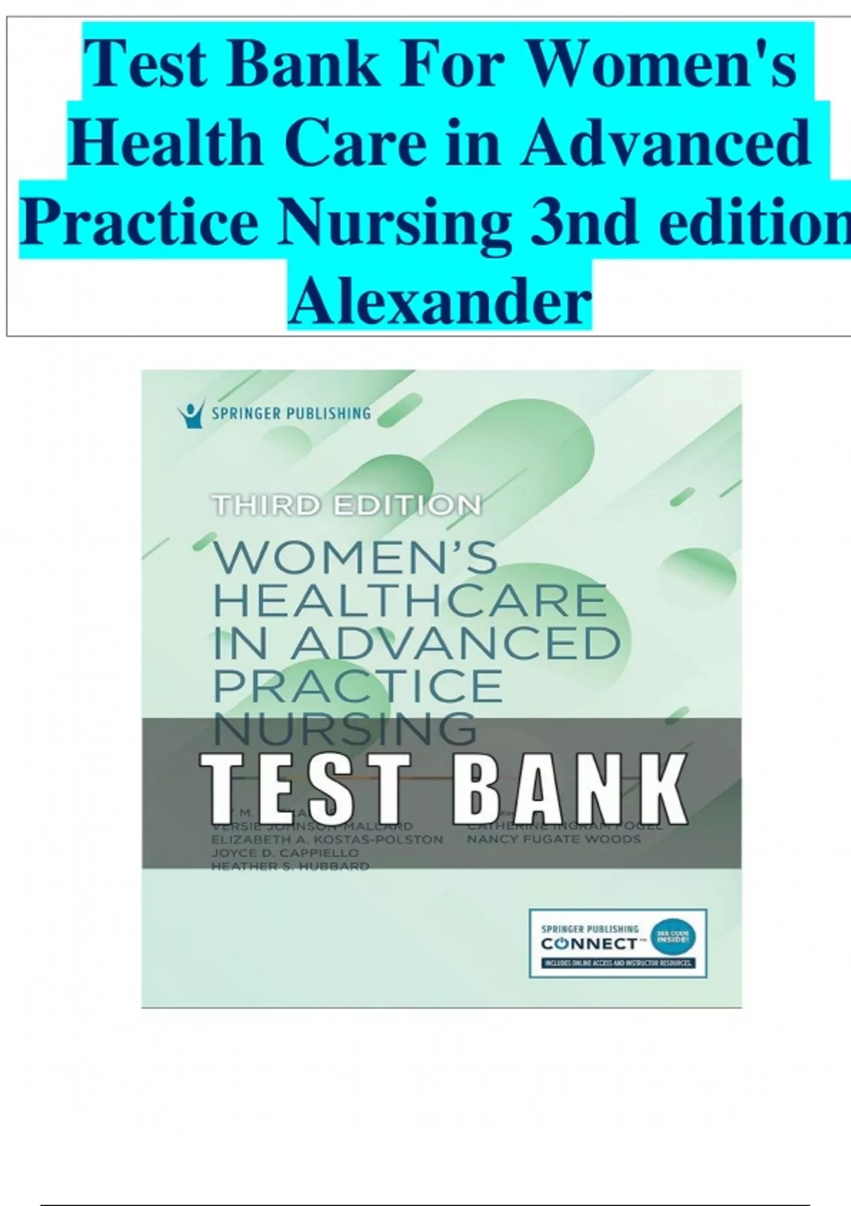 Download the full Test Bank for Women’s Health Care in Advanced Practice Nursing, 3rd Edition by Alexander and Fogel. This resource includes advanced-level questions with rationales covering reproductive health, prenatal and postpartum care, gynecological issues, health promotion, and disease prevention—perfect for WHNP, CNM, and advanced practice nursing students preparing for exams and clinical rotations
