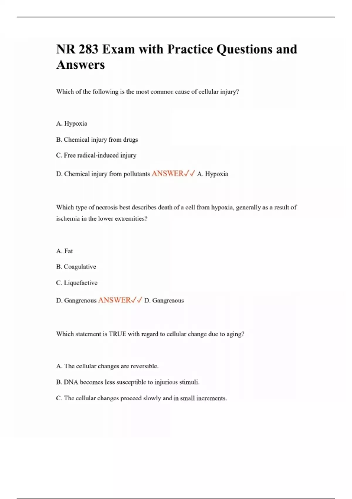 NR 283 Exam with Practice Questions and Answers Which of the following is the most common cause of cellular injury? A. Hypoxia B. Chemical injury from drugs C. Free radical-induced injury D. Chemical injury from pollutants ANSWER A. Hypoxia Which type of necrosis best describes death of a cell from hypoxia, generally as a result of ischemia in the lower extremities? A. Fat B. Coagulative C. Liquefactive D. Gangrenous ANSWER D. Gangrenous Which statement is TRUE with regard to cellular change due to aging? A. The cellular changes are reversible. B. DNA becomes less susceptible to injurious stimuli. C. The cellular changes proceed slowly and in small increments.