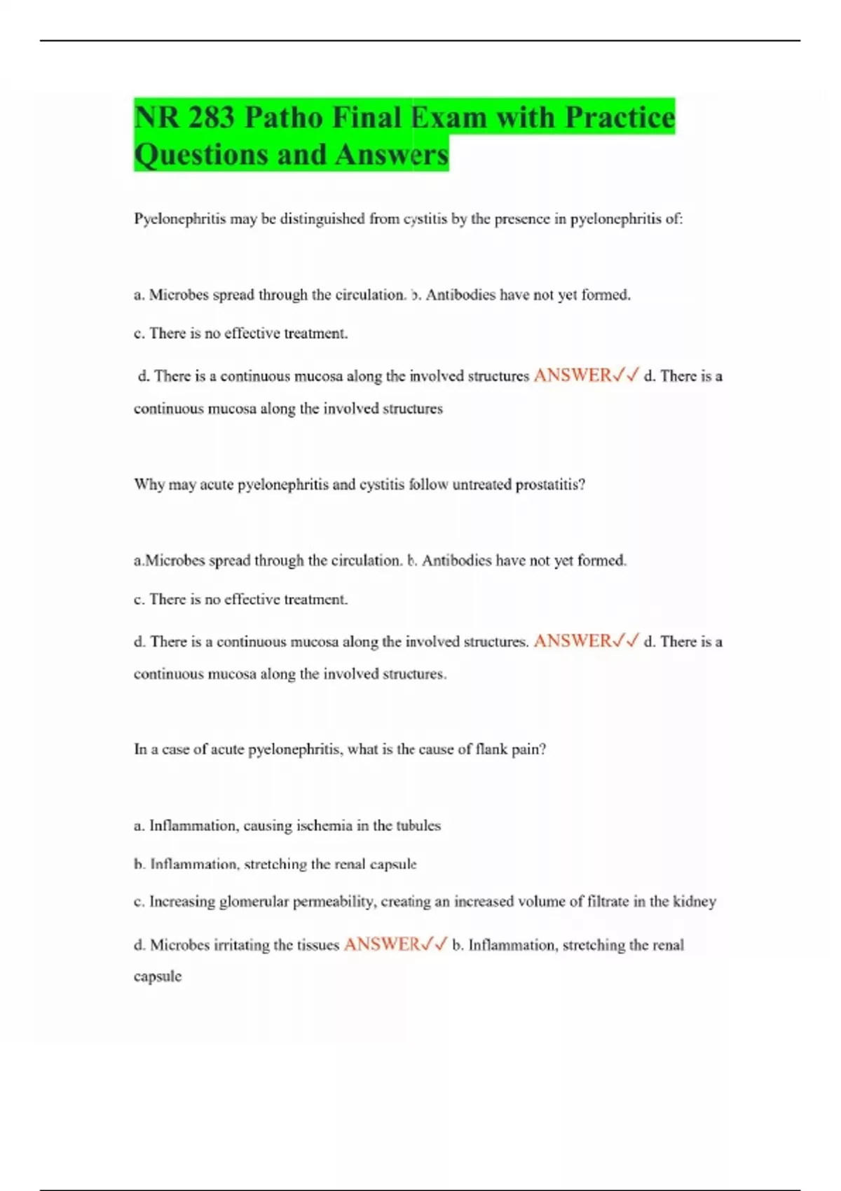 NR 283 Patho Final Exam with Practice Questions and Answers Pyelonephritis may be distinguished from cystitis by the presence in pyelonephritis of: a. Microbes spread through the circulation. b. Antibodies have not yet formed. c. There is no effective treatment. d. There is a continuous mucosa along the involved structures ANSWER d. There is a continuous mucosa along the involved structures Why may acute pyelonephritis and cystitis follow untreated prostatitis? a.Microbes spread through the circulation. b. Antibodies have not yet formed. c. There is no effective treatment. d. There is a continuous mucosa along the involved structures. ANSWER d. There is a continuous mucosa along the involved structures. In a case of acute pyelonephritis, what is the cause of flank pain? a. Inflammation, causing ischemia in the tubules b. Inflammation, stretching the renal capsule c. Increasing glomerular permeability, creating an increased volume of filtrate in the kidney d. Microbes irritating the tissues ANSWER b. Inflammation, stretching the renal capsule