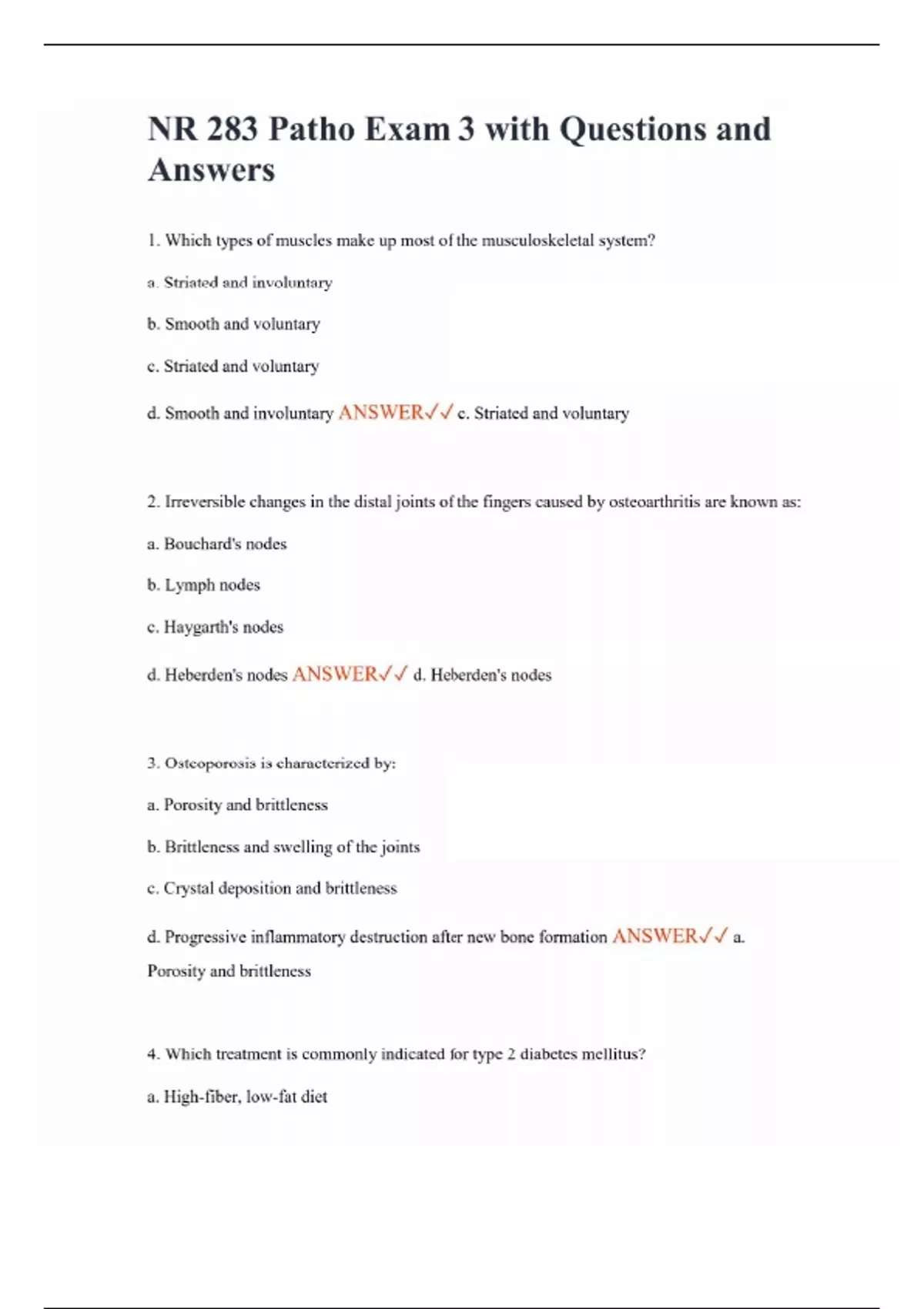 NR 283 Patho Exam 3 with Questions and Answers 1. Which types of muscles make up most of the musculoskeletal system? a. Striated and involuntary b. Smooth and voluntary c. Striated and voluntary d. Smooth and involuntary ANSWER c. Striated and voluntary 2. Irreversible changes in the distal joints of the fingers caused by osteoarthritis are known as: a. Bouchard's nodes b. Lymph nodes c. Haygarth's nodes d. Heberden's nodes ANSWER d. Heberden's nodes 3. Osteoporosis is characterized by: a. Porosity and brittleness b. Brittleness and swelling of the joints c. Crystal deposition and brittleness d. Progressive inflammatory destruction after new bone formation ANSWER a. Porosity and brittleness 4. Which treatment is commonly indicated for type 2 diabetes mellitus? a. High-fiber, low-fat diet