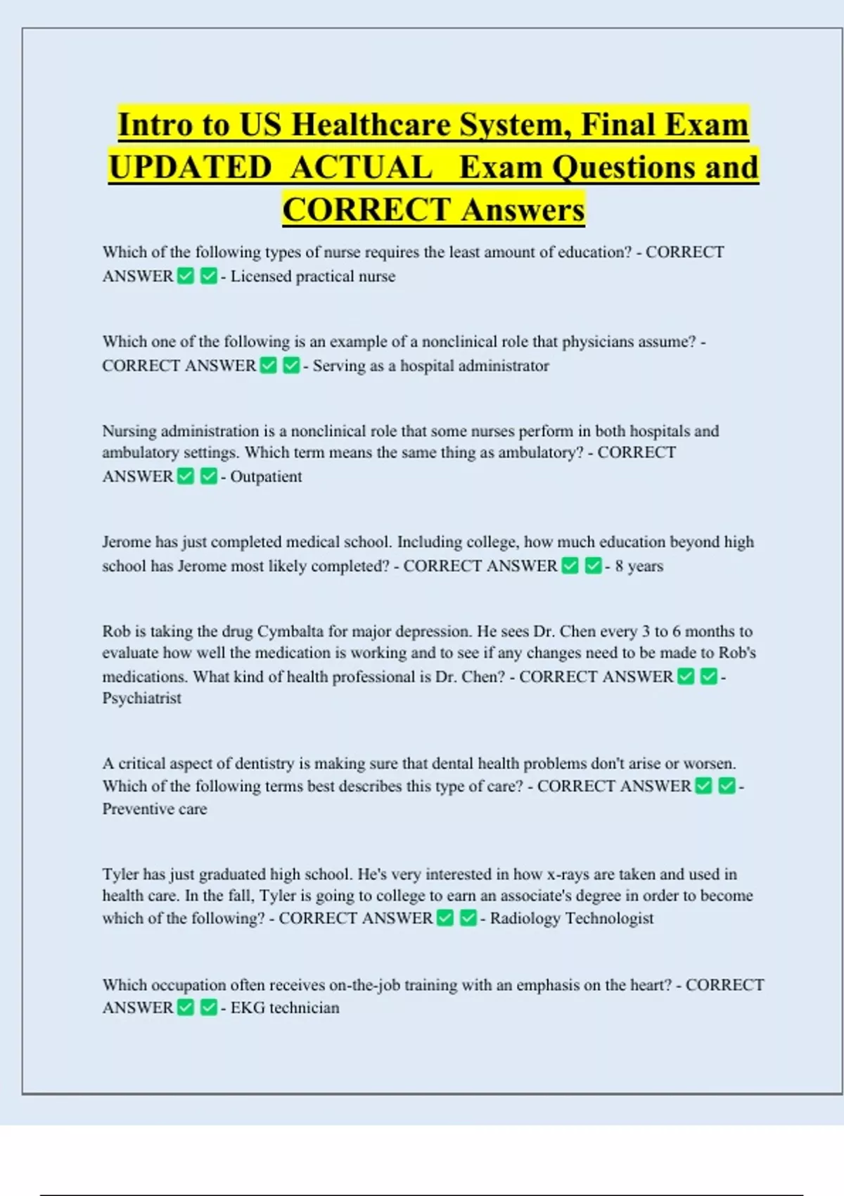 Intro to US Healthcare System, Final Exam UPDATED ACTUAL Exam Questions and CORRECT Answers Which of the following types of nurse requires the least amount of education? - CORRECT ANSWER - Licensed practical nurse Which one of the following is an example of a nonclinical role that physicians assume? - CORRECT ANSWER - Serving as a hospital administrator Nursing administration is a nonclinical role that some nurses perform in both hospitals and ambulatory settings. Which term means the same thing as ambulatory? - CORRECT ANSWER - Outpatient