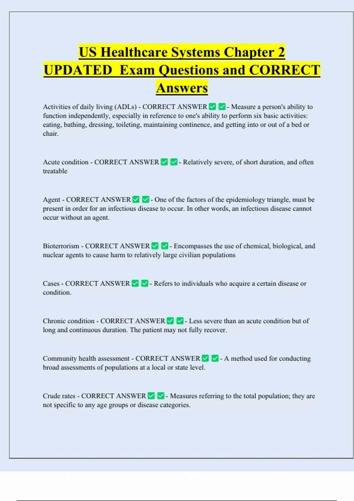US Healthcare Systems Chapter 2 UPDATED Exam Questions and CORRECT Answers Activities of daily living (ADLs) - CORRECT ANSWER - Measure a person's ability to function independently, especially in reference to one's ability to perform six basic activities: eating, bathing, dressing, toileting, maintaining continence, and getting into or out of a bed or chair. Acute condition - CORRECT ANSWER treatable Agent - CORRECT ANSWER - Relatively severe, of short duration, and often - One of the factors of the epidemiology triangle, must be present in order for an infectious disease to occur. In other words, an infectious disease cannot occur without an a