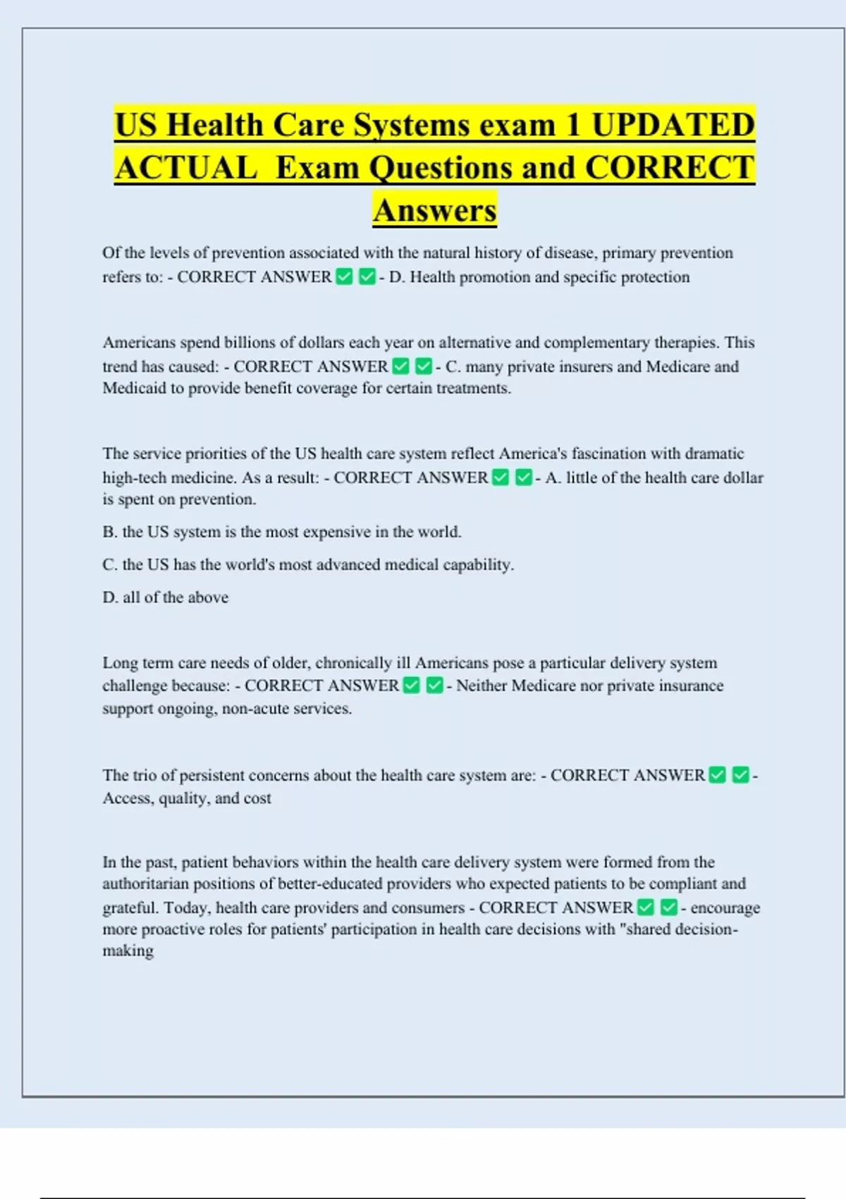 US Health Care Systems exam 1 UPDATED ACTUAL Exam Questions and CORRECT Answers Of the levels of prevention associated with the natural history of disease, primary prevention refers to: - CORRECT ANSWER - D. Health promotion and specific protection Americans spend billions of dollars each year on alternative and complementary therapies. This trend has caused: - CORRECT ANSWER - C. many private insurers and Medicare and Medicaid to provide benefit coverage for certain treatments. The service priorities of the US health care system reflect America's fascination with dramatic high-tech medicine. As a result: - CORRECT ANSWER - A. little of the health care dol