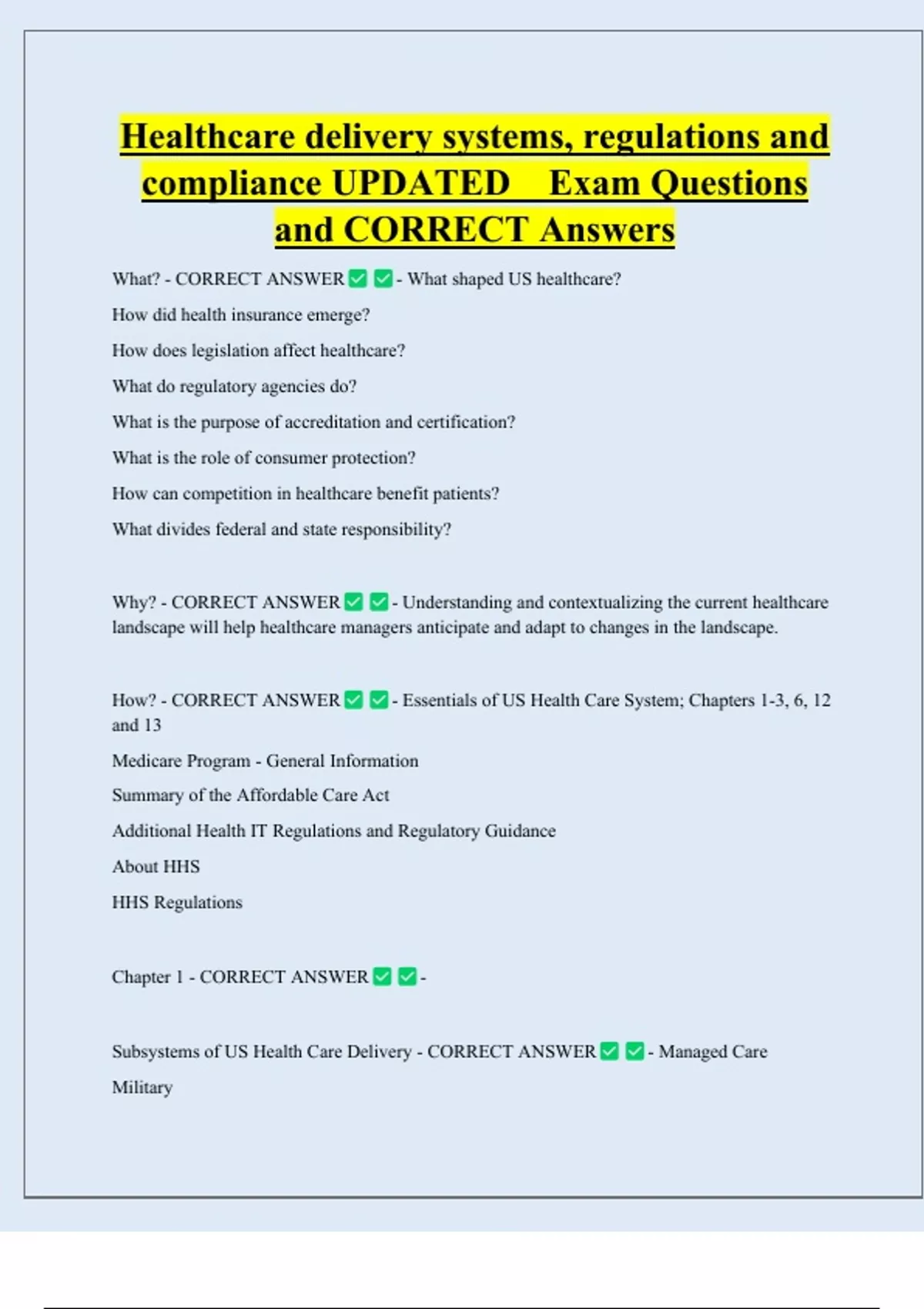Healthcare delivery systems, regulations and compliance UPDATED Exam Questions and CORRECT Answers What? - CORRECT ANSWER How did health insurance emerge? - What shaped US healthcare? How does legislation affect healthcare? What do regulatory agencies do? What is the purpose of accreditation and certification? What is the role of consumer protection? How can competition in healthcare benefit patients? What divides federal and state responsibility? Why? - CORRECT ANSWER - Understanding and contextualizing the current healthcare landscape will help healthcare managers anticipate and adapt to changes in the landscape.