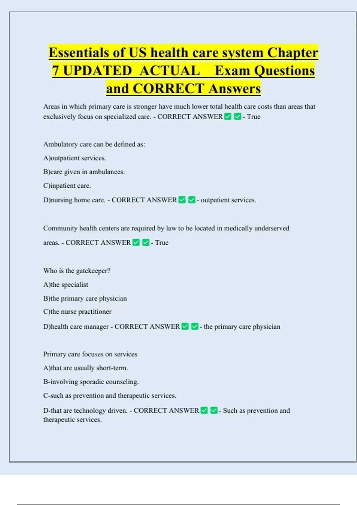 Essentials of US health care system Chapter 7 UPDATED ACTUAL Exam Questions and CORRECT Answers Areas in which primary care is stronger have much lower total health care costs than areas that exclusively focus on specialized care. - CORRECT ANSWER - True Ambulatory care can be defined as: A)outpatient services. B)care given in ambulances. C)inpatient care. D)nursing home care. - CORRECT ANSWER - outpatient services.