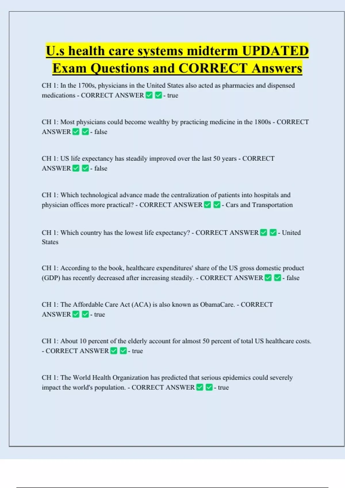 U.s health care systems midterm UPDATED Exam Questions and CORRECT Answers CH 1: In the 1700s, physicians in the United States also acted as pharmacies and dispensed medications - CORRECT ANSWER - true - false CH 1: Most physicians could become wealthy by practicing medicine in the 1800s - CORRECT ANSWER CH 1: US life expectancy has steadily improved over the last 50 years - CORRECT ANSWER - false CH 1: Which technological advance made the centralization of patients into hospitals and physician offices more practical? - CORRECT ANSWER - Cars and Transportation