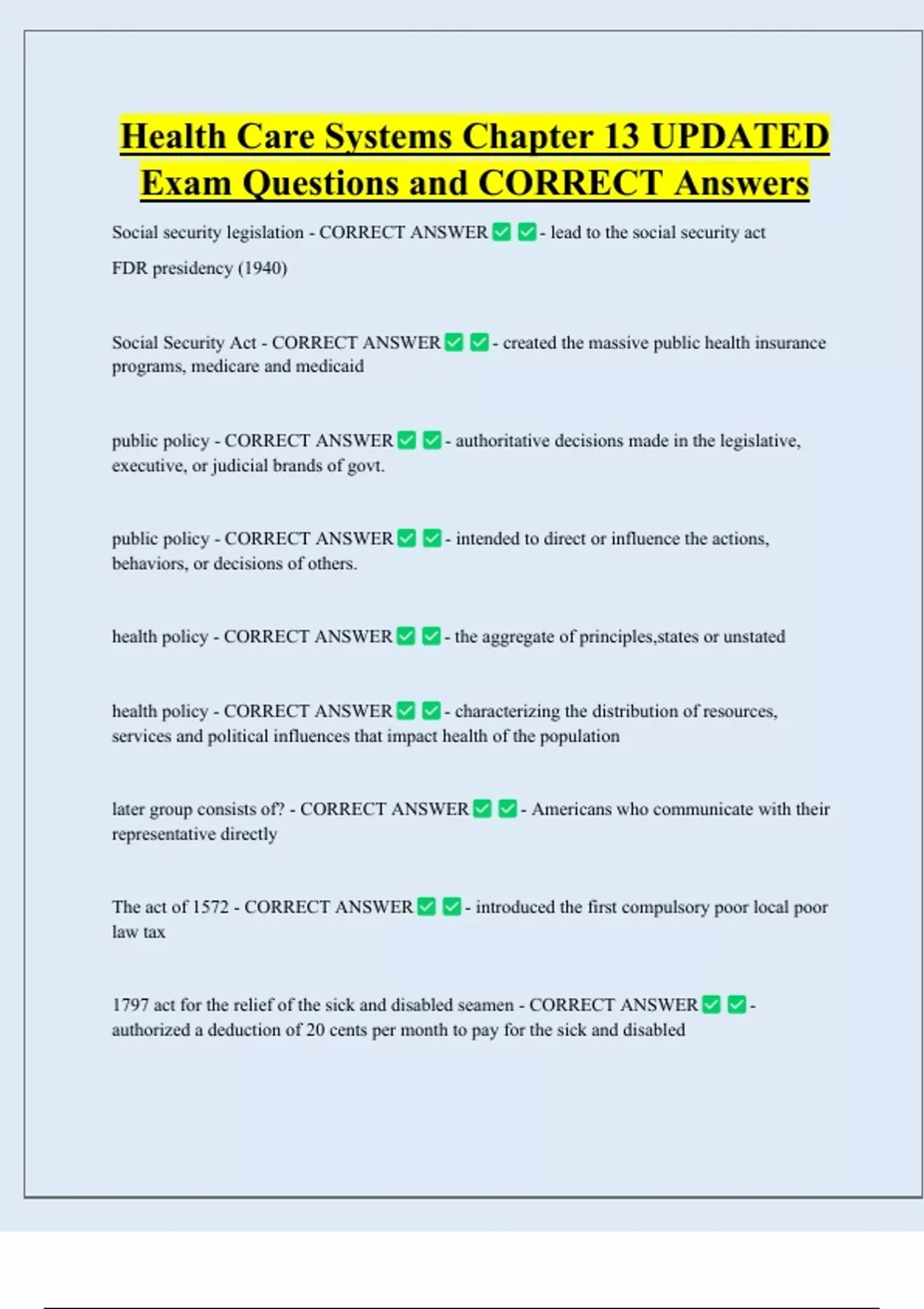 Health Care Systems Chapter 13 UPDATED Exam Questions and CORRECT Answers Social security legislation - CORRECT ANSWER FDR presidency (1940) Social Security Act - CORRECT ANSWER programs, medicare and medicaid public policy - CORRECT ANSWER - lead to the social security act - created the massive public health insurance - authoritative decisions made in the legislativ