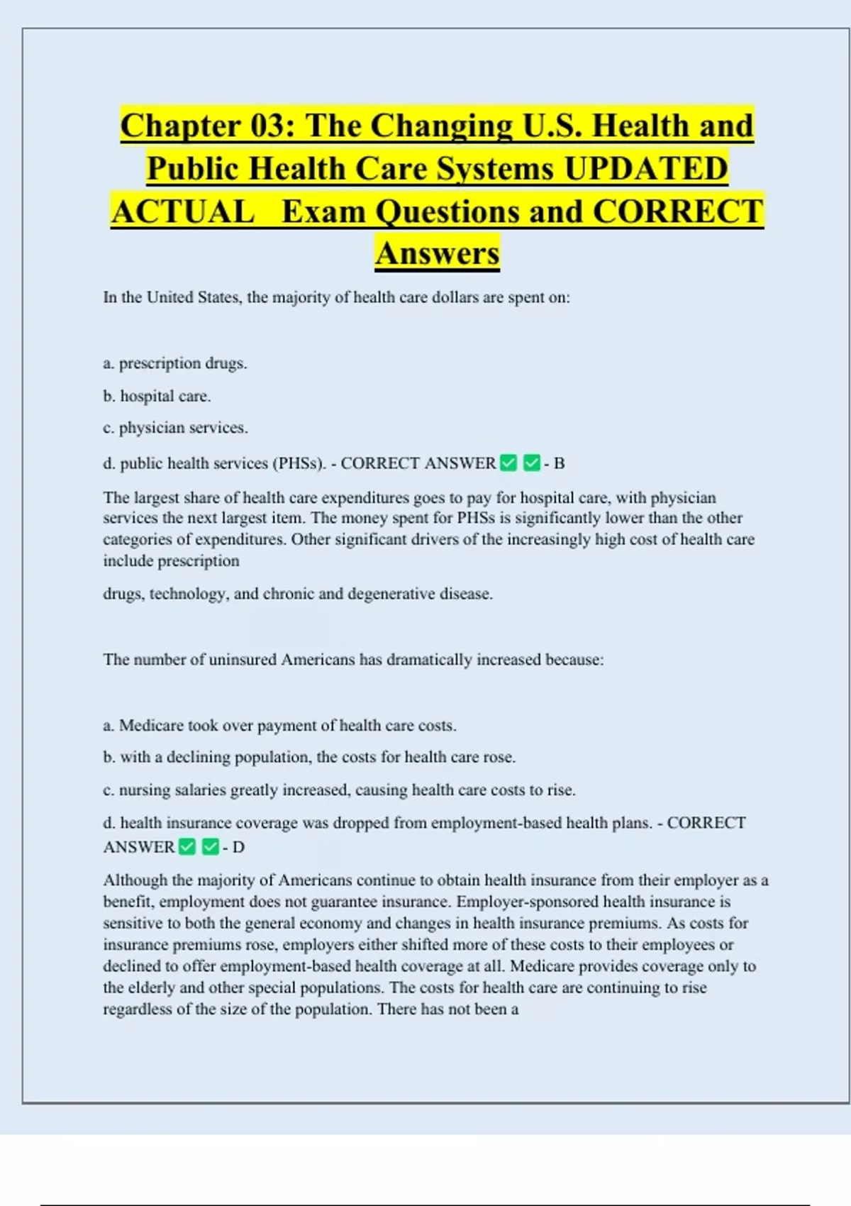 Chapter 03: The Changing U.S. Health and Public Health Care Systems UPDATED ACTUAL Exam Questions and CORRECT Answers In the United States, the majority of health care dollars are spent on: a. prescription drugs. b. hospital care. c. physician services. d. public health services (PHSs). - CORRECT ANSWER - B The largest share of health care expenditures goes to pay for hospital care, with physician services the next largest item. The money spent for PHSs is significantly lower than the other categories of expenditures. Other significant drivers of the increasingly high cost of hea