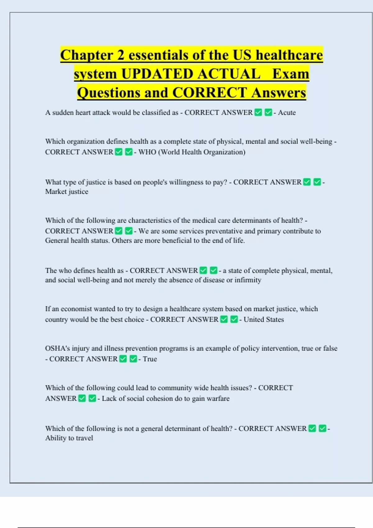 Chapter 2 essentials of the US healthcare system UPDATED ACTUAL Exam Questions and CORRECT Answers A sudden heart attack would be classified as - CORRECT ANSWER - Acute Which organization defines health as a complete state of physical, mental and social well-being - CORRECT ANSWER - WHO (World Health Organization) What type of justice is based on people's willingness to pay? - CORRECT ANSWER Market justice Which of the following are characteristics of the medical care determinants of health? - CORRECT ANSWER - We are some services preventative and primary contribute to General health status. Others are more beneficial to the end of life. The who defines health as - CORRECT ANSWER -