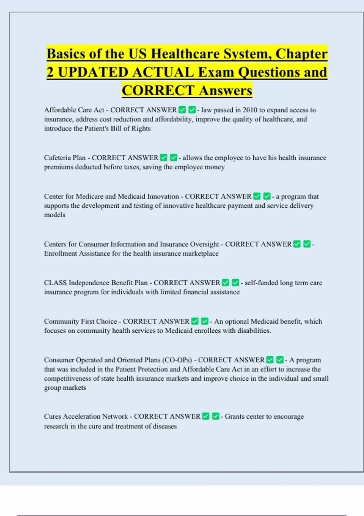 Basics of the US Healthcare System, Chapter 2 UPDATED ACTUAL Exam Questions and CORRECT Answers Affordable Care Act - CORRECT ANSWER - law passed in 2010 to expand access to insurance, address cost reduction and affordability, improve the quality of healthcare, and introduce the Patient's Bill of Rights Cafeteria Plan - CORRECT ANSWER - allows the employee to have his health insurance premiums deducted before taxes, saving the employee money Center for Medicare and Medicaid Innovation - CORRECT ANSWER - a program that supports the development and testing of innovative healthcare payment and service deliv