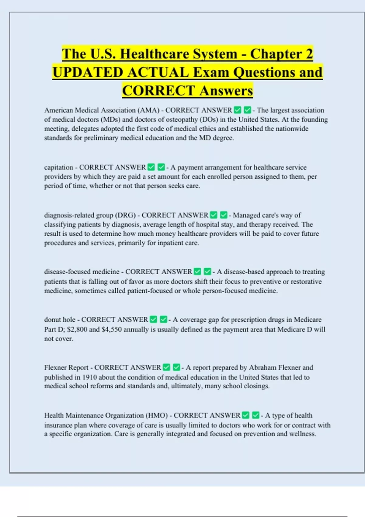 The U.S. Healthcare System - Chapter 2 UPDATED ACTUAL Exam Questions and CORRECT Answers American Medical Association (AMA) - CORRECT ANSWER - The largest association of medical doctors (MDs) and doctors of osteopathy (DOs) in the United States. At the founding meeting, delegates adopted the first code of medical ethics and established the nationwide standards for preliminary medical education and the MD degree. capitation - CORRECT ANSWER - A payment arrangement for healthcare service providers by which they are paid a set amount for each enrolled person assigned to them, per period of time, whether or not that person seeks care.