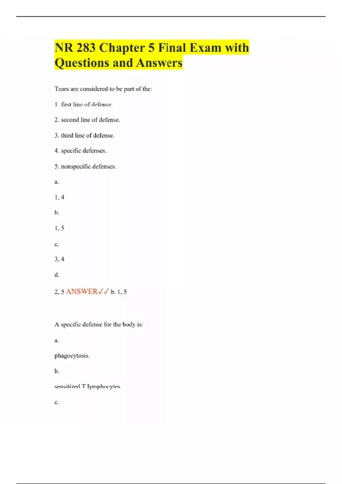 NR 283 Chapter 5 Final Exam with Questions and Answers Tears are considered to be part of the: 1. first line of defense. 2. second line of defense. 3. third line of defense. 4. specific defenses. 5. nonspecific defenses. a. 1, 4 b. 1, 5 c. 3, 4 d. 2, 5 ANSWER b. 1, 5 A specific defense for the body is: a. phagocytosis. b. sensitized T lymphocytes. c. the inflammatory response. d. intact skin and mucous membranes. ANSWER b. sensitized T lymphocytes.
