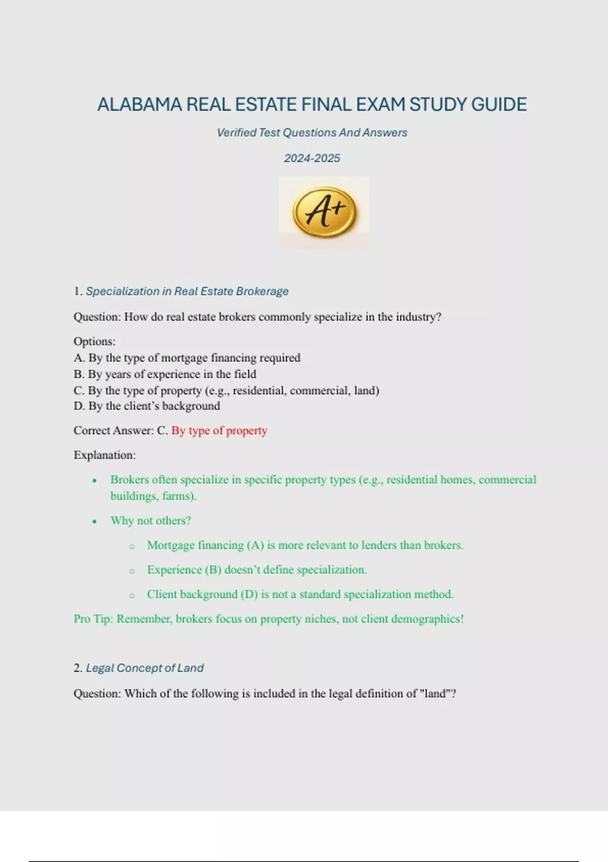 Pass the Alabama Real Estate Exam on Your First Try! This AREC-approved study guide covers every topic from the 60-hour pre-license course with 200+ exam-style questions, detailed explanations, and memory tricks to help you ace the test. What’s Included: 100% Updated for – Aligned with the latest Alabama Real Estate Commission (AREC) requirements. Detailed Rationales – Not just answers, but why they’re correct (and why others are wrong). Pro Tips & Mnemonics – Like “HOCA” for adverse possession (Hostile, Open, Continuous, Actual). Math Made Easy – Loan-to-value (LTV), prorations, and appreciation formulas broken into simple steps. Key Laws Simplified – TILA, RESPA, Fair Housing, and Alabama-specific rules. Perfect For: Alabama real estate pre-license students (Salesperson & Broker exams). Last-minute cramming – Includes a quick-reference cheat sheet. Visual learners – Bolded keywords and organized tables. Bonus: Free exam-day checklist (e.g., what to bring, how to manage time). Instant Digital Download – Study anytime, anywhere!