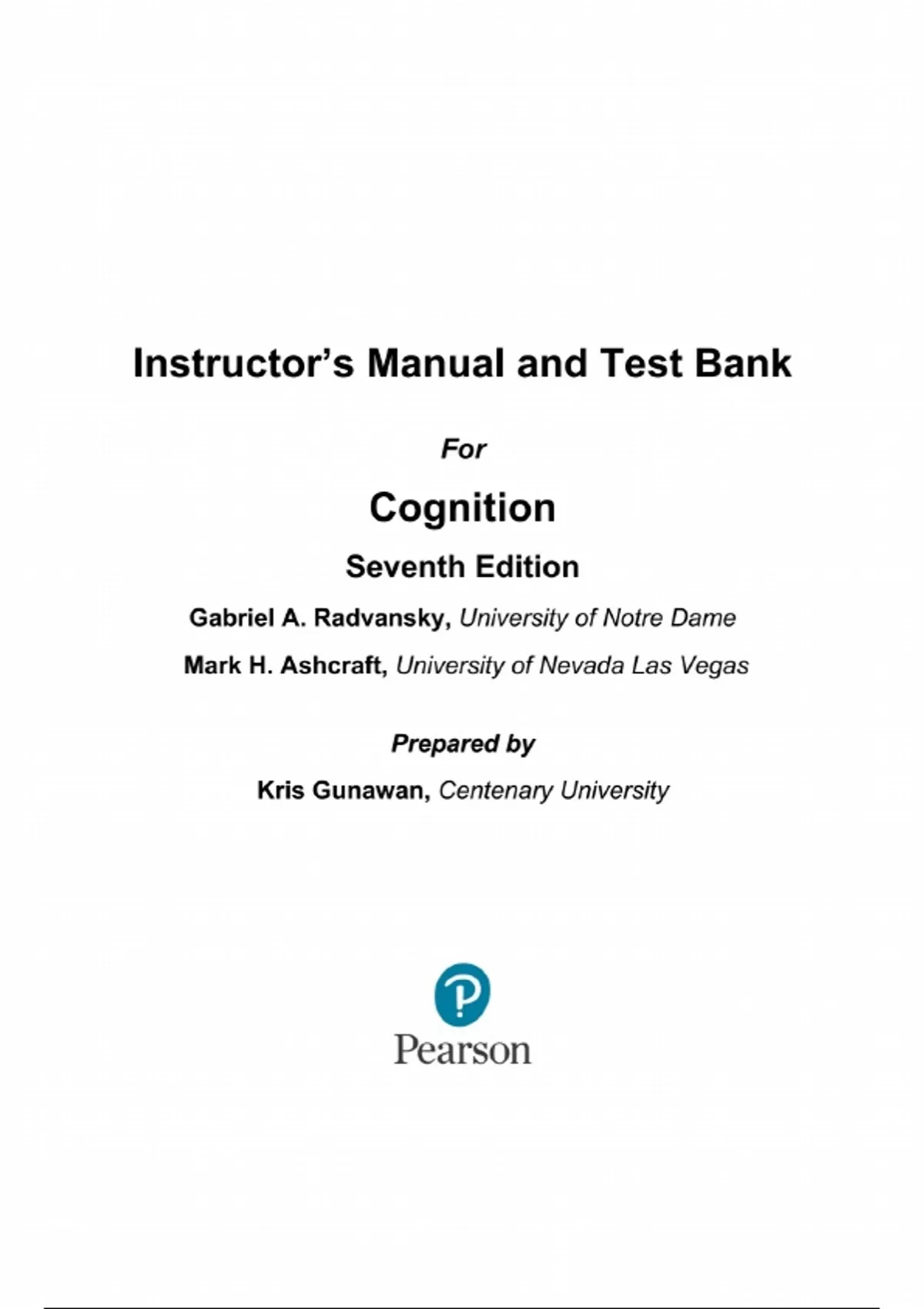 Solutions Manual & Test Bank for Cognition 7th Edition by Gabriel A Radvansky, (All Chapters 1-15). Full Chapters Include;...Cognitive Psychology Cognitive Neuroscience Sensation and Perception Attention Short-Term Working Memory Learning and Remembering Knowing Memory and Forgetting Language Comprehension Reasoning and Decision Making Problem Solving Emotion Cognitive Development in Infants and Children Cognitive Aging