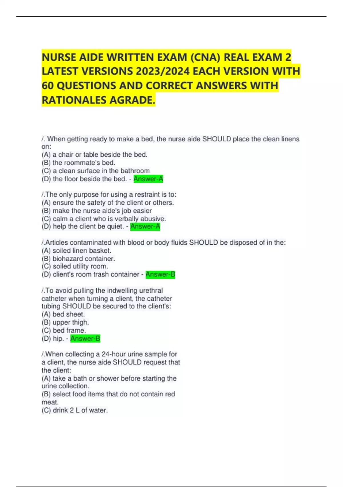 NURSE AIDE WRITTEN EXAM (CNA) REAL EXAM 2 LATEST VERSIONS 2023/2024 EACH VERSION WITH 60 QUESTIONS AND CORRECT ANSWERS WITH RATIONALES AGRADE.