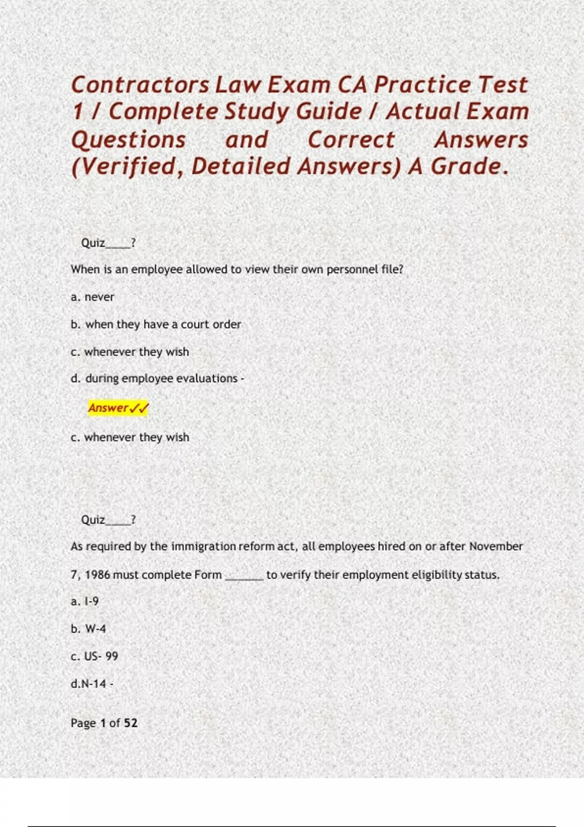 Contractors Law Exam CA Practice Test 1 / Complete Study Guide / Actual Exam Questions and Correct Answers (Verified, Detailed Answers) A Grade. Quiz____? When is an employee allowed to view their own personnel file? a. never b. when they have a court order c. whenever they wish d. during employee evaluations - Answer c. whenever they wish Quiz____? As required by the immigration reform act, all employees hired on or after November 7, 1986 must complete Form ______ to verify their employment eligibility status. a. I-9 b. W-4 c. US- 99 d.N-14 - Answer a. I-9 Quiz____? By law, a "hard laborer" may not be younger than _____ years old. a. 14 b. 15 c. 16 d. 17 - Answer c. 16 years of age