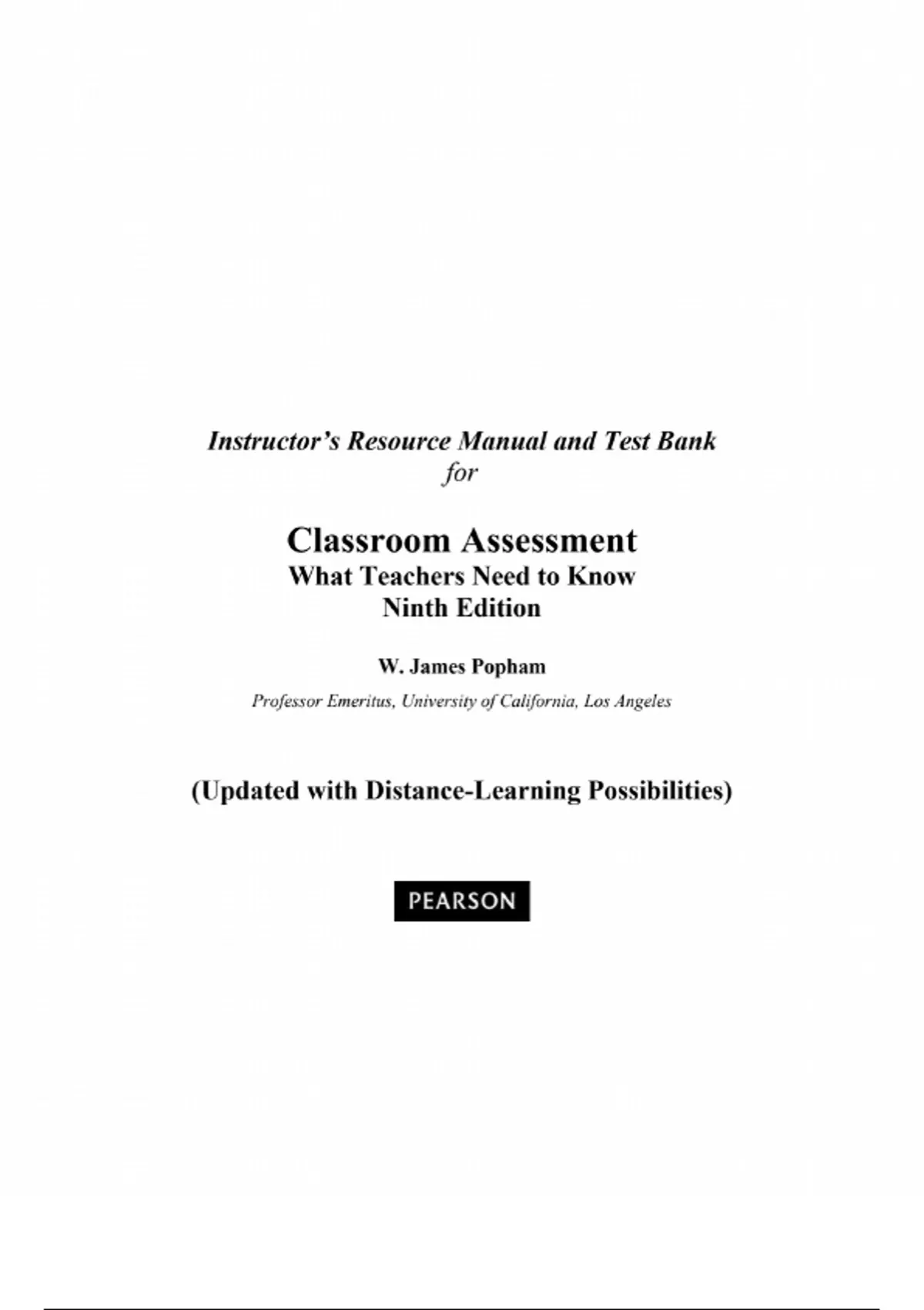 Solutions Manual and Test Bank for Classroom Assessment What Teachers Need to Know 9th Edition By James Popham (All Chapters 1-16). Why Do Teachers Need to Know About Assessment? Deciding What to Assess Reliability of Assessment Validity Fairness Selected-Response Tests Constructed-Response Tests Performance Assessment Portfolio Assessment Affective Assessment Improving Teacher-Developed Assessments Formative Assessment Making Sense Out of Standardized Test Scores Appropriate and Inappropriate Test-Preparation Practices The Evaluation of Instruction Assessment-Based Grading