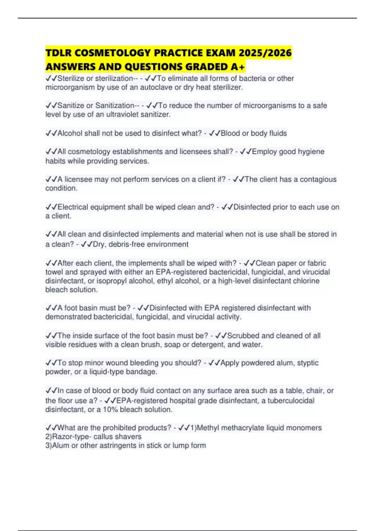 TDLR COSMETOLOGY PRACTICE EXAM 2025/2026 ANSWERS AND QUESTIONS GRADED A+