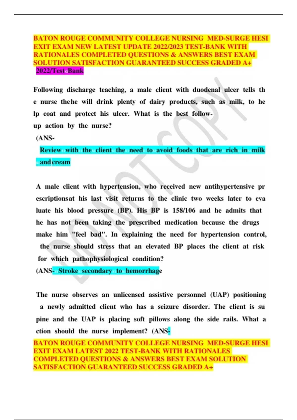 BATON ROUGE COMMUNITY COLLEGE NURSING MED-SURGE HESI EXIT EXAM NEW LATEST UPDATE 2022/2023 TEST-BANK WITH RATIONALES COMPLETED QUESTIONS & ANSWERS BEST EXAM SOLUTION SATISFACTION GUARANTEED SUCCESS GRADED A+