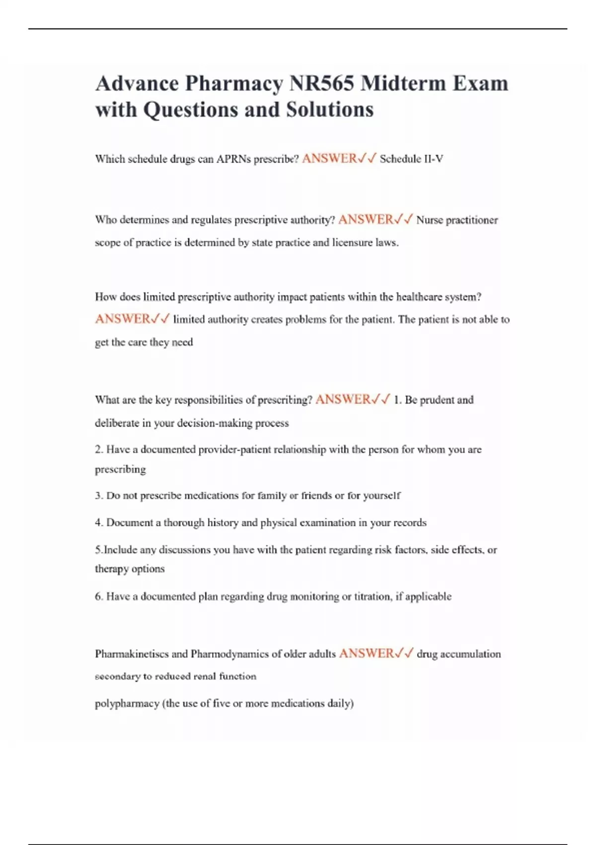 Advance Pharmacy NR565 Midterm Exam with Questions and Solutions Which schedule drugs can APRNs prescribe? ANSWER Schedule II-V Who determines and regulates prescriptive authority? ANSWER Nurse practitioner scope of practice is determined by state practice and licensure laws. How does limited prescriptive authority impact patients within the healthcare system? ANSWER limited authority creates problems for the patient. The patient is not able to get the care they need What are the key responsibilities of prescribing? ANSWER 1. Be prudent and deliberate in your decision-making process 2. Have a documented provider-patient relationship with the person for whom you are prescribing 3. Do not prescribe medications for family or friends or for yourself 4. Document a thorough history and physical examination in your records 5.Include any discussions you have with the patient regarding risk factors, side effects, or therapy options 6. Have a documented plan regarding drug monitoring or titration, if applicable Pharmakinetiscs and Pharmodynamics of older adults ANSWER drug accumulation secondary to reduced renal function polypharmacy (the use of five or more medications daily)