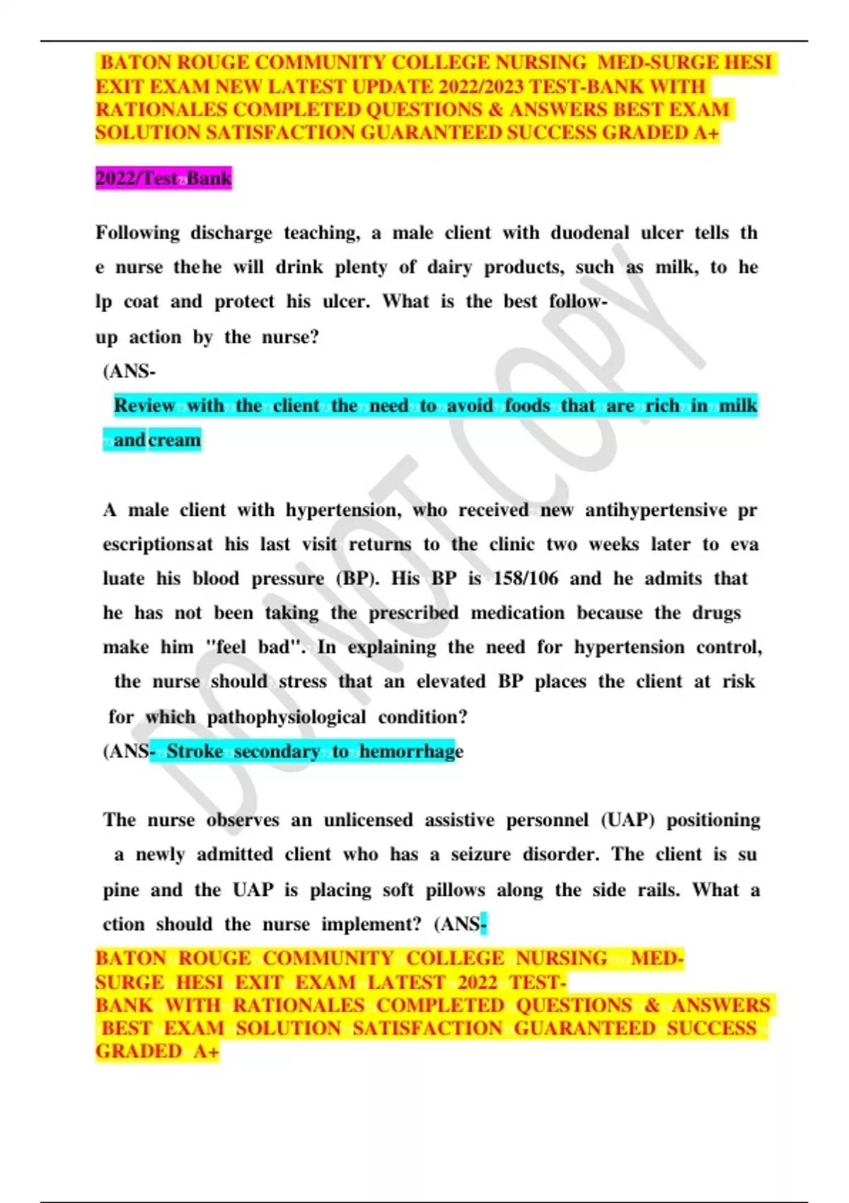 BATON ROUGE COMMUNITY COLLEGE NURSING MED-SURGE HESI EXIT EXAM NEW LATEST UPDATE 2022/2023 TEST-BANK WITH RATIONALES COMPLETED QUESTIONS & ANSWERS BEST EXAM SOLUTION SATISFACTION GUARANTEED SUCCESS GRADED A+