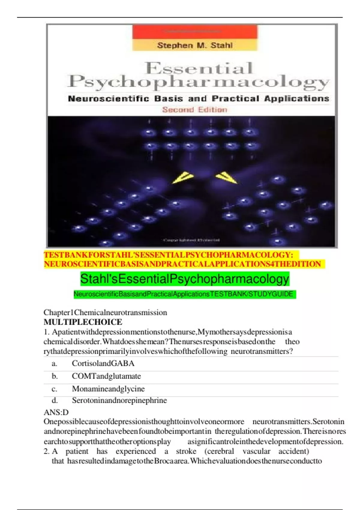 TESTBANKFORSTAHL'SESSENTIALPSYCHOPHARMACOLOGY: