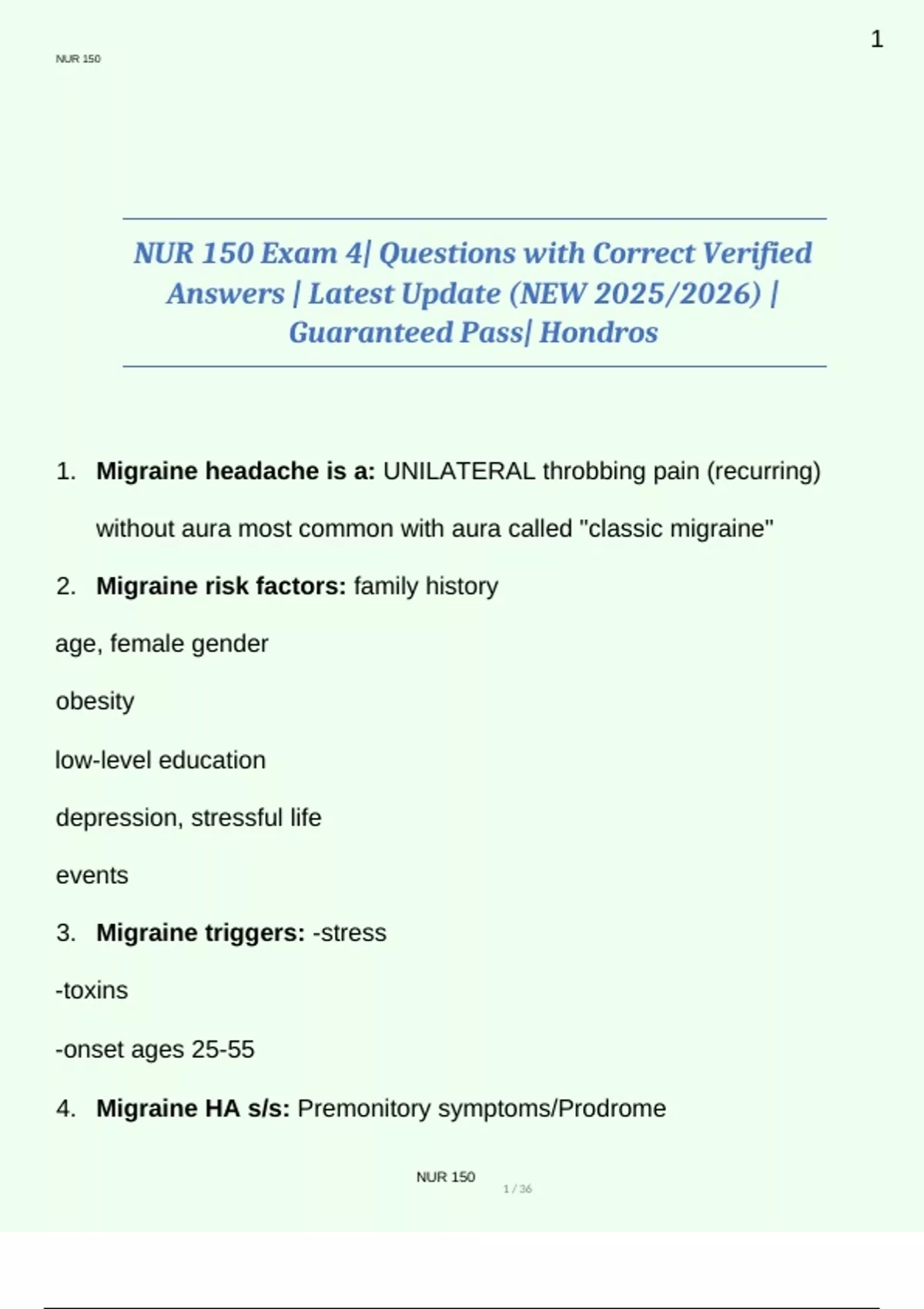 1. Migraine headache is a: UNILATERAL throbbing pain (recurring)