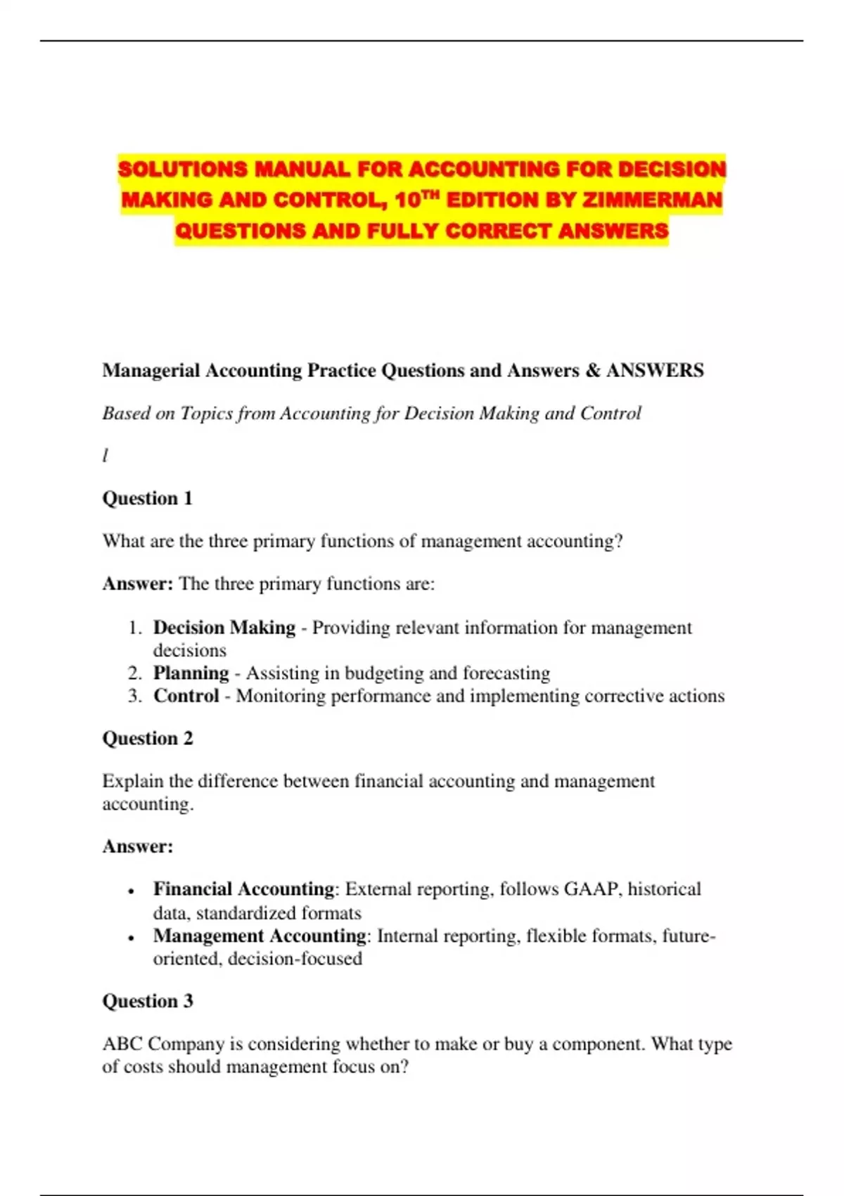 Managerial Accounting Practice Questions and Answers & ANSWERS