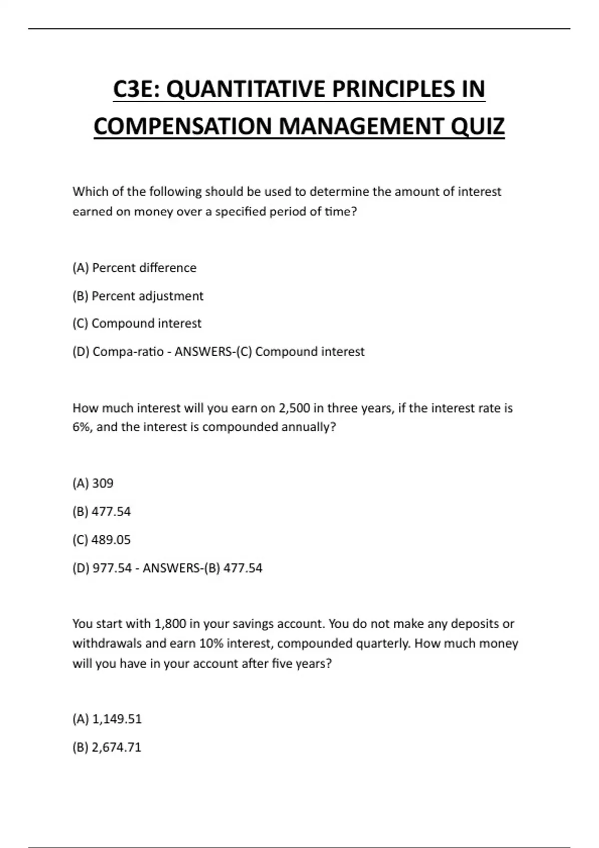 C3E: QUANTITATIVE PRINCIPLES IN COMPENSATION MANAGEMENT QUIZ QUESTIONS AND ANSWERS 2025