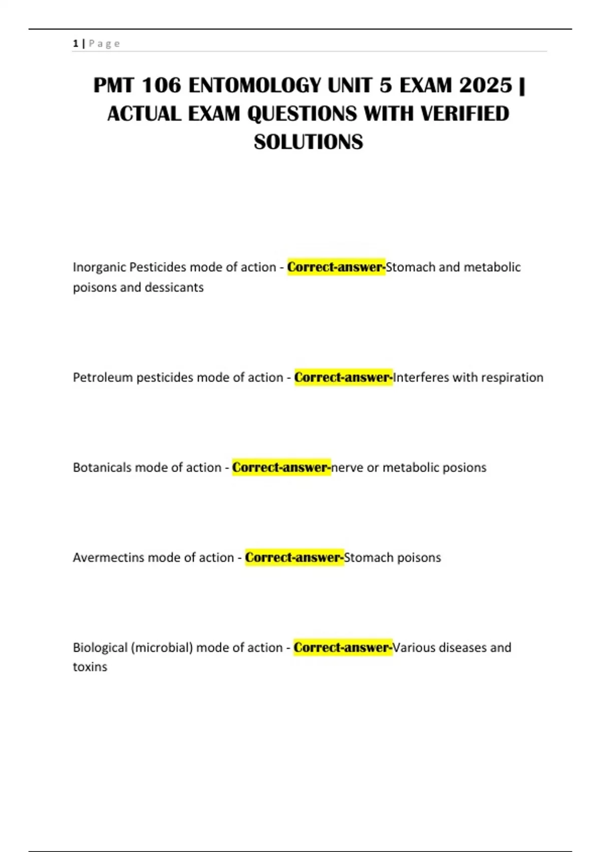 PMT 106 ENTOMOLOGY UNIT 5 EXAM 2025 | ACTUAL EXAM QUESTIONS WITH VERIFIED SOLUTIONS