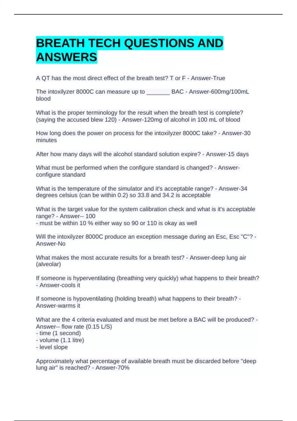 BREATH TECH QUESTIONS AND ANSWERS A QT has the most direct effect of the breath test? T or F - Answer-True The intoxilyzer 8000C can measure up to _______ BAC - Answer-600mg/100mL blood What is the proper terminology for the result when the breath test is complete? (saying the accused blew 120) - Answer-120mg of alcohol in 100 mL of blood How long does the power on process for the intoxilyzer 8000C take? - Answer-30 minutes After how many days will the alcohol standard solution expire? - Answer-15 days What must be performed when the configure standard is changed? - Answer-configure standard What is the temperature of the simulator and it's acceptable range? - Answer-34 degrees celsius (can be within 0.2) so 33.8 and 34.2 is acceptable What is the target value for the system calibration check and what is it's acceptable range? - Answer-- 100 - must be within 10 % either way so 90 or 110 is okay as well Will the intoxilyzer 8000C produce an exception message during an Esc, Esc "C"? - Answer-No What makes the most accurate results for a breath test? - Answer-deep lung air (alveolar) If someone is hyperventilating (breathing very quickly) what happens to their breath? - Answer-cools it If someone is hypoventilating (holding breath) what happens to their breath? - Answer-warms it What are the 4 criteria evaluated and must be met before a BAC will be produced? - Answer-- flow rate (0.15 L/S) - time (1 second) - volume (1.1 litre) - level slope Approximately what percentage of available breath must be discarded before "deep lung air" is reached? - Answer-70% Will a poor quality sample underestimate the BAC? - Answer-Yes How many "suitable" samples must be obtained - Answer-2 Is there a limit on how many samples you can take? - Answer-no limit How is the second breath test for the subject conducted? - Answer-Esc, Esc "R" If you have two tests that are not within 20mg of one another, the third can can be conducted after ________ minutes - Answer-17 minutes What are the 3 audible tones? - Answer-- single tone (pass) - continuous tone (flow rate met, breath analysis) - high low tone - fail Explain how the intoxilyzer works in general terms - Answer-- Breath is blown through an approved instrument - Breath goes through an infared sensor - Infared detector conducts light energy to voltage - Result is a mg of alcohol in ml of blood What is the message when the results are 20mg apart from one another? - Answer-no 020 agreement (re test subject) What is the certificate of analyst? - Answer-- legal document for alcohol standard solution - proves solution is suitable for accuracy of intoxilyzer 8000C Who is the QT designated by? - Answer-soliciter general What does good agreement mean? - Answer-2 suitable samples that do not differ from 20mg of alcohol in 100 mL of blood What does the certificate of analyst help form? - Answer-conclusive proof What are 5 times the alcohol standard solution needs to be changed? - Answer-- 50 calibration checks conducted - past 15 days (expired) - no certificate of analyst - solution expired - system calibration check outside range for unknown reason Can you purchase an intoxilyzer 8000C from any hardware store? - Answer-no Is it possible to incorrectly hook up a simulator to the intoxilyzer 8000C? - Answer-yes When all 4 criteria are met what will appear in front of the breath test result? - Answer-a zero What is the breath test sequence? - Answer-- 5 system blank checks