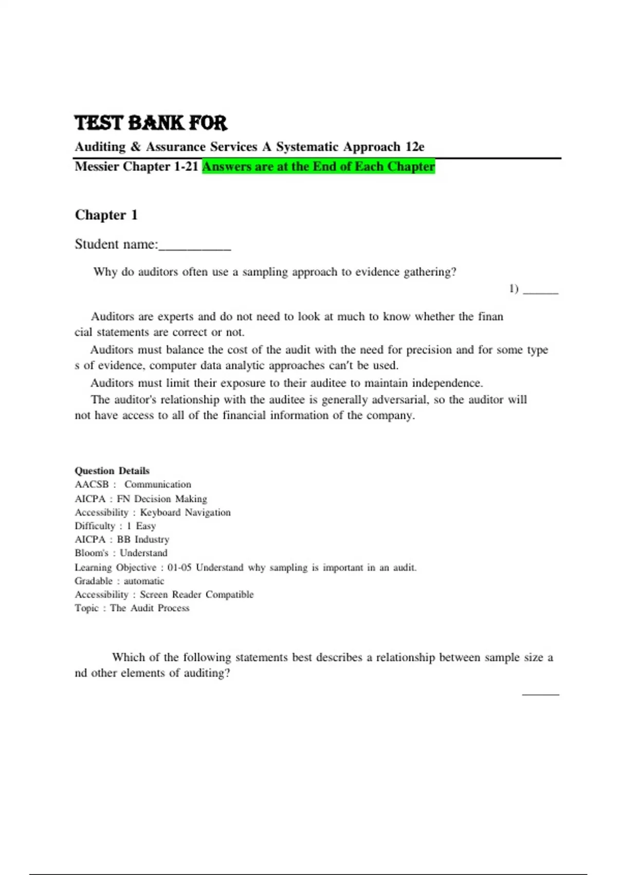 Test Bank for Auditing & Assurance Services A Systematic Approach 12th Edition Messier 2025 || All Chapter ( 1-21 ) A+