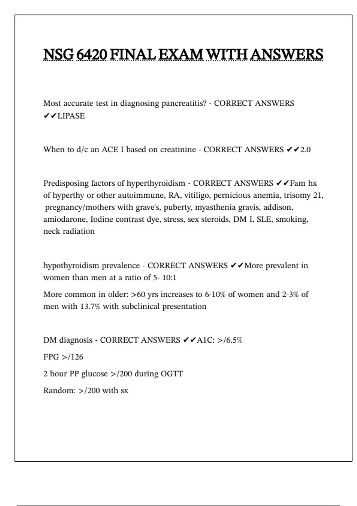 DM diagnosis - CORRECT ANSWERS ✔✔A1C: >/6.5%