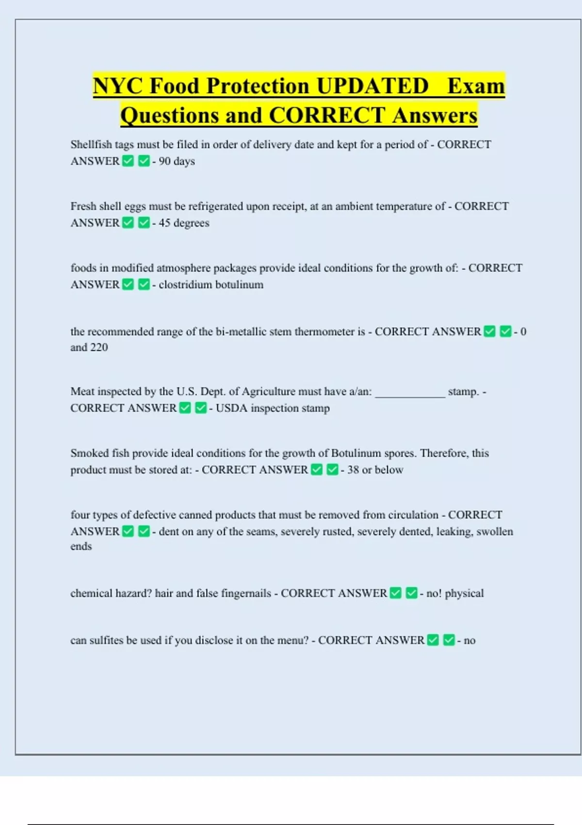 NYC Food Protection UPDATED Exam Questions and CORRECT Answers Shellfish tags must be filed in order of delivery date and kept for a period of - CORRECT ANSWER - 90 days Fresh shell eggs must be refrigerated upon receipt, at an ambient temperature of - CORRECT ANSWER - 45 degrees foods in modified atmosphere packages provide ideal conditions for the growth of: - CORRECT ANSWER - clostridium botulinum the recommended range of the bi-metallic stem thermometer is - CORRECT ANSWER and 220 Meat inspected by the U.S. Dept. of Agriculture must have a/an: ____________ stamp. - CORRECT ANSWER - USDA inspection stamp Smoked fish provide ideal conditions for the growth of Botulinum spores. Therefore, this product must be stored at: - CORRECT ANSWER - 38 or below four types of defective canned products that must be removed from circulation - CORRECT ANSWER - dent on any of the seams, severely rusted, severely dented, leaking, swollen ends chemical hazard? hair and false fingernails - CORRECT ANSWER - no! physical can sulfites be used if you disclose it on the menu? - CORRECT ANSWER - no - 0