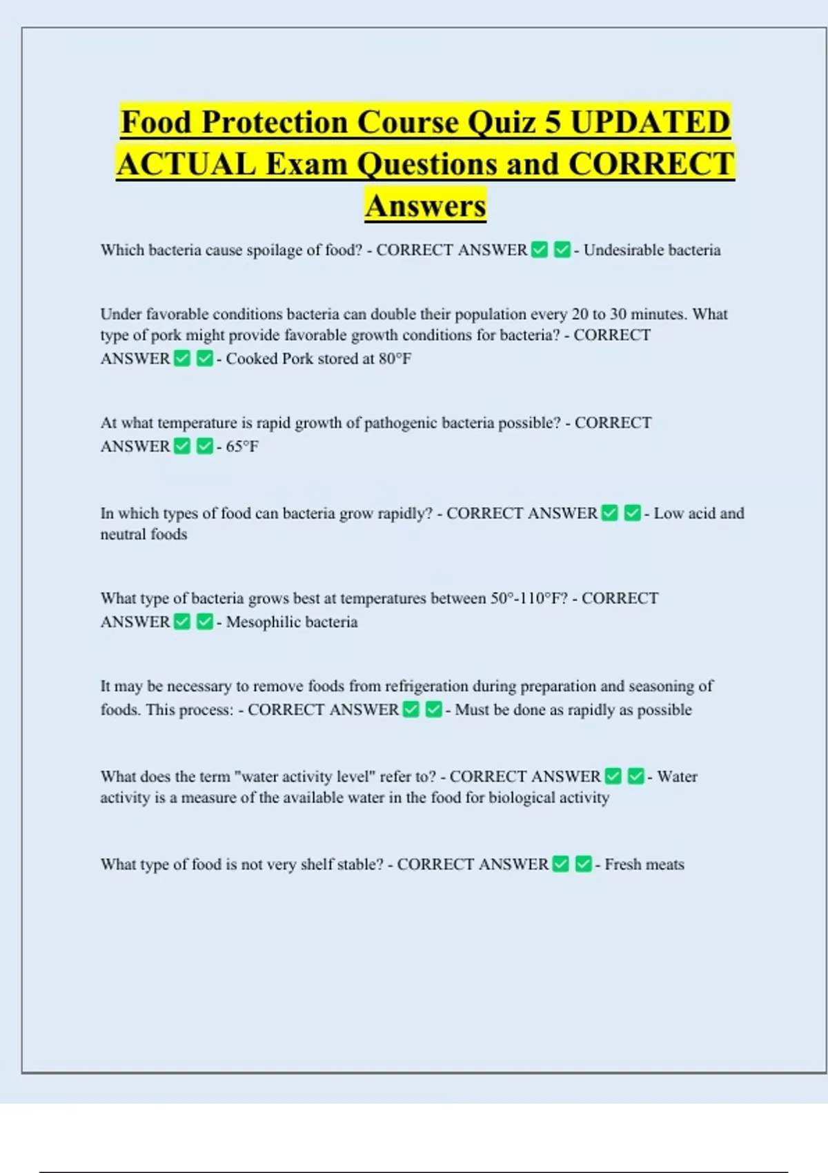 Food Protection Course Quiz 5 UPDATED ACTUAL Exam Questions and CORRECT Answers Which bacteria cause spoilage of food? - CORRECT ANSWER - Undesirable bacteria Under favorable conditions bacteria can double their population every 20 to 30 minutes. What type of pork might provide favorable growth conditions for bacteria? - CORRECT ANSWER - Cooked Pork stored at 80°F At what temperature is rapid growth of pathogenic bacteria possible? - CORRECT