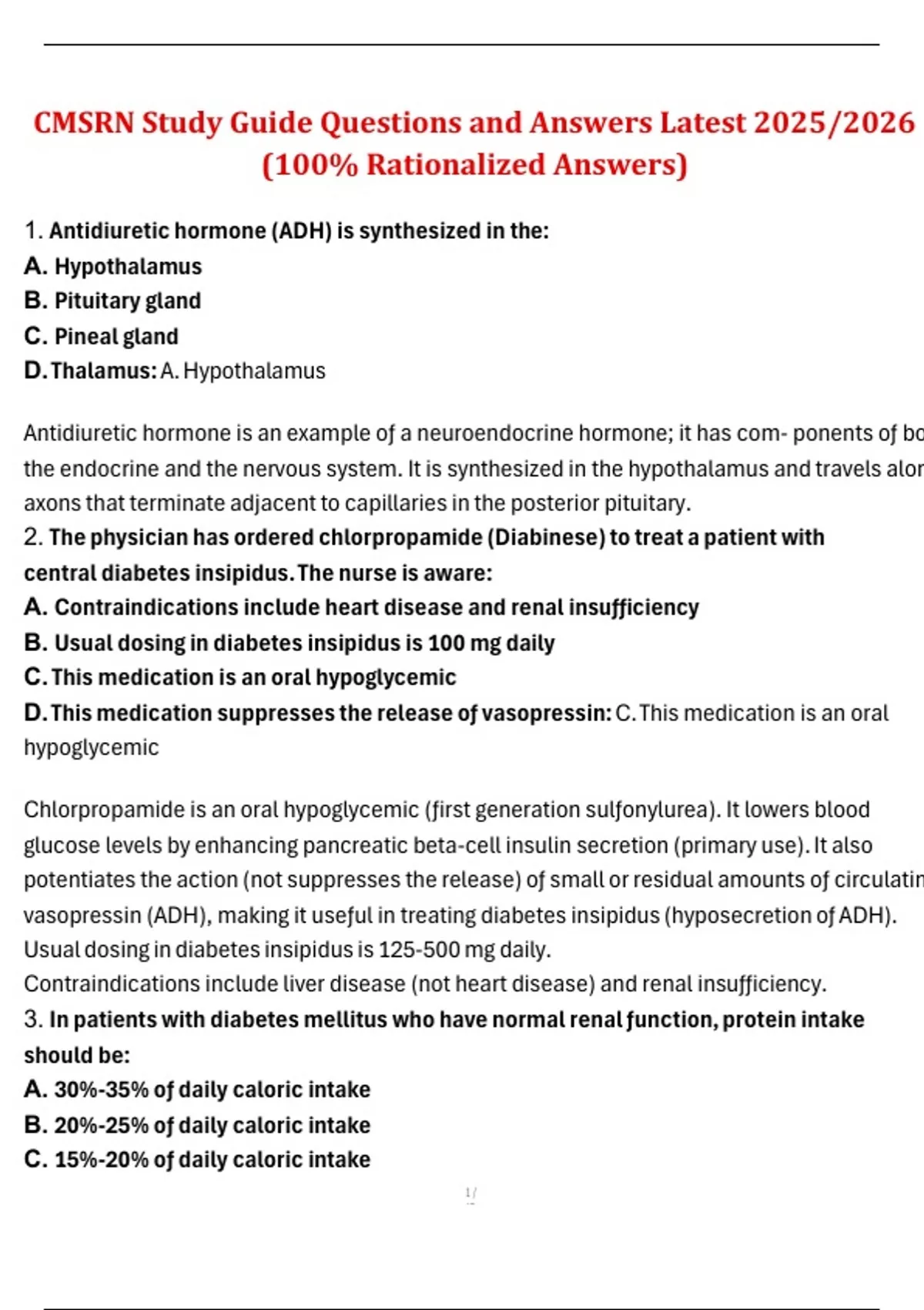 1. Antidiuretic hormone (ADH) is synthesized in the:
