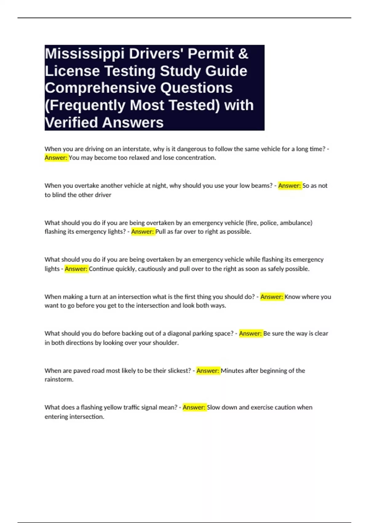 Mississippi Drivers' Permit & License Testing Study Guide Comprehensive Questions (Frequently Most Tested) with Verified Answers