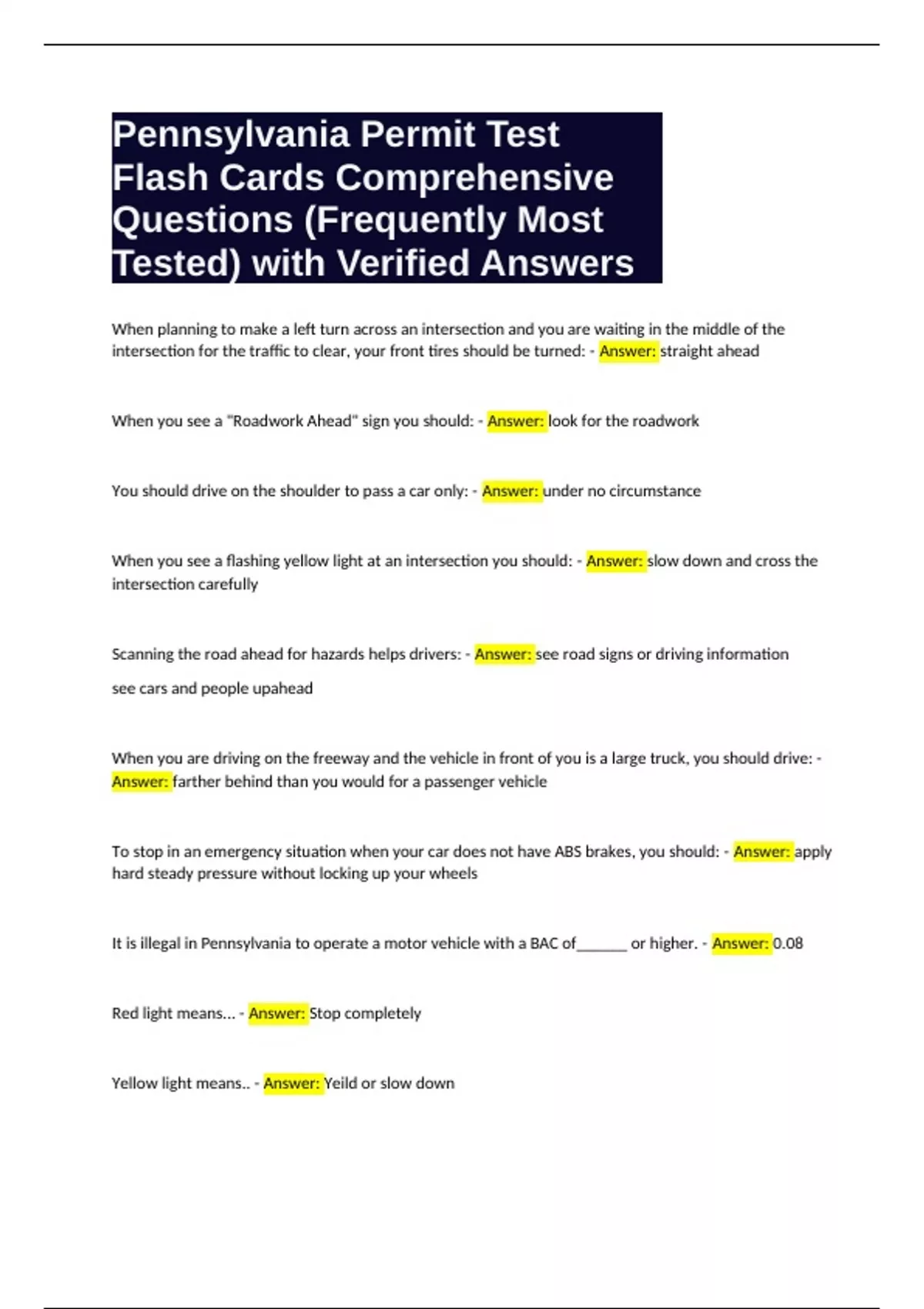 Pennsylvania Permit Test Flash Cards Comprehensive Questions (Frequently Most Tested) with Verified Answers