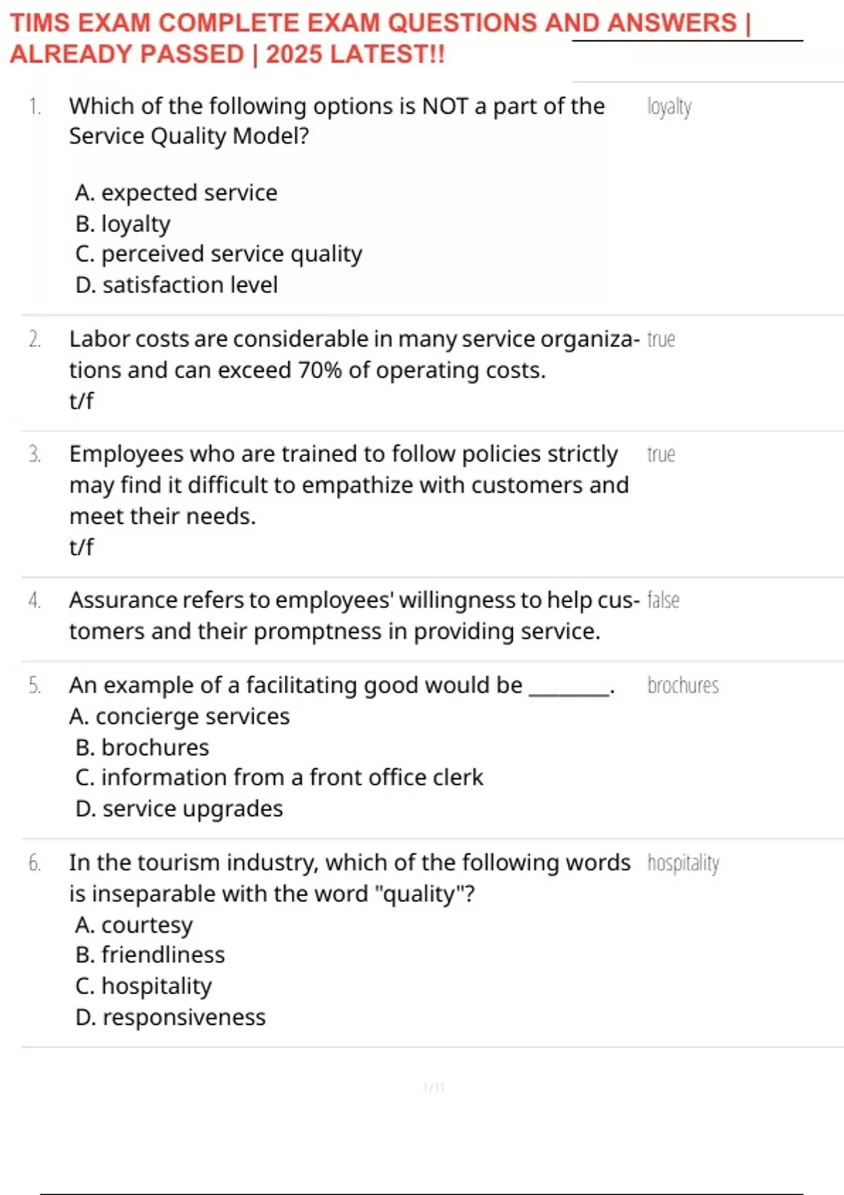 6. In the tourism industry, which of the following words hospitality