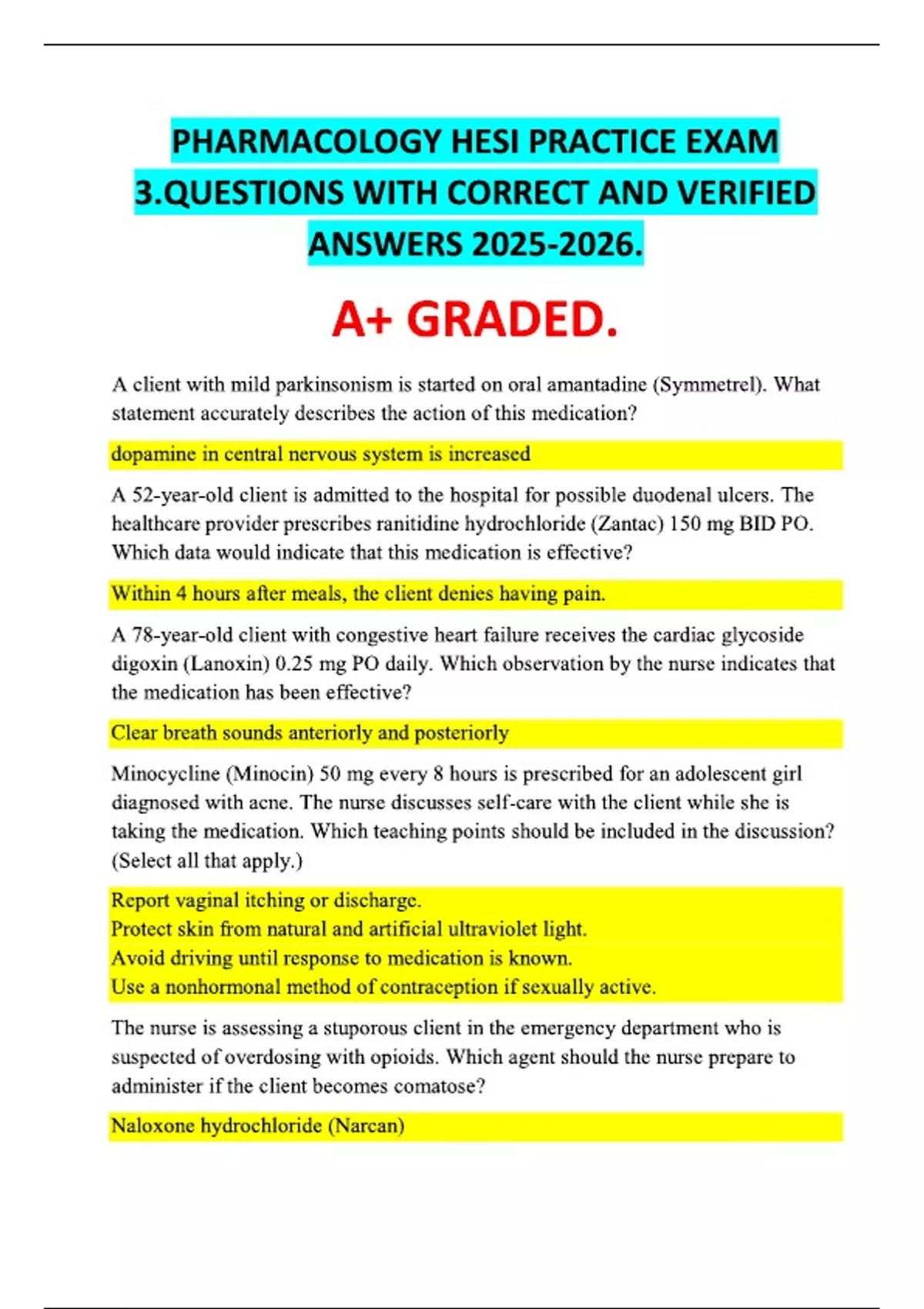 PHARMACOLOGY HESI PRACTICE EXAM 3.QUESTIONS WITH CORRECT AND VERIFIED ANSWERS . A+ GRADED.