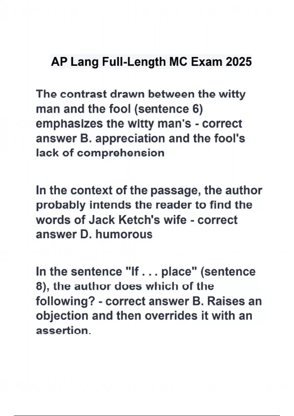 The contrast drawn between the witty man and the fool (sentence 6) emphasizes the witty man's - correct answer B. appreciation and the fool's lack of comprehension In the context of the passage, the author probably intends the reader to find the words of Jack Ketch's wife - correct answer D. humorous In the sentence "If . . . place" (sentence 8), the author does which of the following? - correct answer B. Raises an objection and then overrides it with an assertion. The sentence "Neither . . . offensive" (sentence 5) does which of the following? - correct answer C. Answers a possible objection. Which of the following best describes the speaker's professed attitude toward the reputation of Jack Ketch? - correct answer A. Admiration verging on envy Which of the following sentences best represents the author's main point in the passage? - correct answer A. "Franklin has a particular resonance in twenty- first century America." (Paragraph 1). The final paragraph functions as - correct answer C. an authorial judgment about a preceding discussion The misunderstanding discussed in Paragraph 3 is that many who study Franklin - correct answer B. confuse Franklin's public statements with his private beliefs "They" in Paragraph 2 of the passage refers to people who - correct answer D. have reservations about Franklin's values The rhetorical purpose of Paragraph 1 ("And we ... values") is to - correct answer E. prompt the reader to feel kinship with Franklin on the basis of the challenges he faced Which of the following is true of the voice of the passage? - correct answer E. It conveys a sense of confidence and authority. The second sentence (Paragraph 1) implies which of the following conclusions? - correct answer C. Lasting happiness will always elude us. The remark of the Greek epigrammatist (Paragraph 1) is best interpreted as which of the following? - correct answer A. Cynical commentary