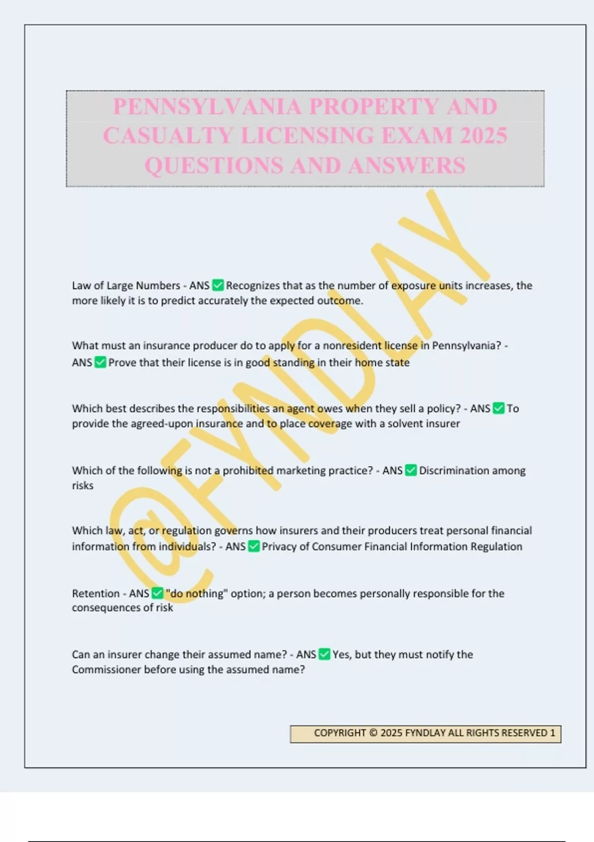 Law of Large Numbers - ANS Recognizes that as the number of exposure units increases, the more likely it is to predict accurately the expected outcome. What must an insurance producer do to apply for a nonresident license in Pennsylvania? - ANS Prove that their license is in good standing in their home state Which best describes the responsibilities an agent owes when they sell a policy? - ANS To provide the agreed-upon insurance and to place coverage with a solvent insurer Which of the following is not a prohibited marketing practice? - ANS Discrimination among risks Which law, act, or regulation governs how insurers and their producers treat personal financial information from individuals? - ANS Privacy of Consumer Financial Information Regulation Retention - ANS "do nothing" option; a person becomes personally responsible for the consequences of risk Can an insurer change their assumed name? - ANS Yes, but they must notify the Commissioner before using the assumed name? PENNSYLVANIA PROPERTY AND CASUALTY LICENSING EXAM 2025 QUESTIONS AND ANSWERS COPYRIGHT © 2025 FYNDLAY ALL RIGHTS RESERVED 2 Contract of Adhesion - ANS "take-it-or-leave-it," drafted by one party; other party has no opportunity to negotiate terms and prices. Party must "adhere" to provisions as presented Tad used unauthorized material to assist him on his examination for his insurance producer license. He justified this by saying the materials would be available to him in a real life situation. Which statement is true? - ANS Tad committed a prohibited act. What is the maximum fine that may be imposed upon a producer for violating two of the Commissioner's orders? - ANS $20,000; A fine of up to $10,000 for each violation of an order issued by the commissioner. Admitted Insurer - ANS An insurance company authorized and licensed to transact business in a particular state. Which of the following is not acting as an insurance producer? - ANS Brian, who is a VP at AllPro's human resources department and does not receive commissions Edwin has decided not to retain the risk of home ownership himself. What method of risk does he choose when he purchases homeowners insurance? - ANS Transfer: the risk of loss is transferred from the insured to the insurance company in exchange for a premium payment Alien Insurer - ANS Incorporated in a country other than the United States What fine will the Commissioner impose for the practice of unfair methods of competition? - ANS Up to $5,000 for each violation (but not more than $50,000 in a 6 month period) Which of the following is not an unfair claims settlement practice if committed by an insurance company in Pennsylvania? - ANS Failing to promptly settle a claim for which liability is uncertain. (An insurer is not obligated to settle a claim for which it's not clearly liable) Which of the following would NOT be considered misrepresentation of an insurance policy? - ANS Enthusiastically promoting an insurance product COPYRIGHT © 2025 FYNDLAY ALL RIGHTS RESERVED 3 Which of the following statements BEST describes the transfer of risk via an insurance contract? - ANS Not all risks are transferable via insurance contracts Must the Commissioner conduct an examination of every foreign or alien insurer licensed in Pennsylvania? - ANS The Commissioner may choose to waive examinations under certain circumstances Aleatory Contract - ANS One party may receive a benefit that is out of proportion to the consideration he or she paid for. Bill failed to satisfy the continuing education requirements to keep his producer's license active in Pennsylvania. Two years later, he decides to renew his license. Can he do so? - ANS No, he must apply for a new license. Which of the following is NOT the action of an agent considering the best interests of an applicant or insured? - ANS Making a misrepresentation of the terms of a proposed policy Who is the head of the Pennsylvania Insurance Department? - ANS Insurance Commissioner May a producer charge a service fee for completing a consumer's insurance application? - ANS No What must an insurance company do to employ someone as a producer? - ANS *File a notice of appointment with the Department.* The department then will verify if the producer is eligible for appointment. If ineligible, they will notify the insurer. The insurer pays a fee for every appointment. To boost her insurance sales at the end of the year, Trudy started offering potential clients a $250 cash gift card in exchange for purchasing an insurance policy. Which prohibited sales practice has she committed? - ANS Rebating (offering anything of value in exchange for the purchase of insurance) COPYRIGHT © 2025 FYNDLAY ALL RIGHTS RESERVED 4 Within how many days must the Commissioner approve or disapprove rates? - ANS 30 The federal Fair Credit Reporting Act protects the rights of: - ANS Consumers Larry submitted a claim under his homeowners insurance policy. The insurance company has the burden of proof to show that the loss is excluded; otherwise, it must pay Larry's claim. What causes of loss are contained on Larry's policy. - ANS Open Perils Open Peril - ANS All perils except those specifically excluded Sara sustains a water damage loss to her home due to torrential rains that flooded her neighborhood. She reports the loss to her agent and says that according to the insuring agreement of her policy, she is insured against risks of direct loss to her property. Is she covered for this damage to her property? - ANS No, this kind of loss is typically excluded. Are losses by flood covered in homeowners policies? - ANS No, this type of loss is specifically excluded in homeowners policies. It can be obtained in some cases by endorsement or through the National Flood Insurance Program (NFIP) Which of the following is NOT an example of a peril, or cause of loss? - ANS Blocked exit in a burning building delaying entry to firefighters (this is a hazard, not a peril) What is the maximum amount for which the Pen