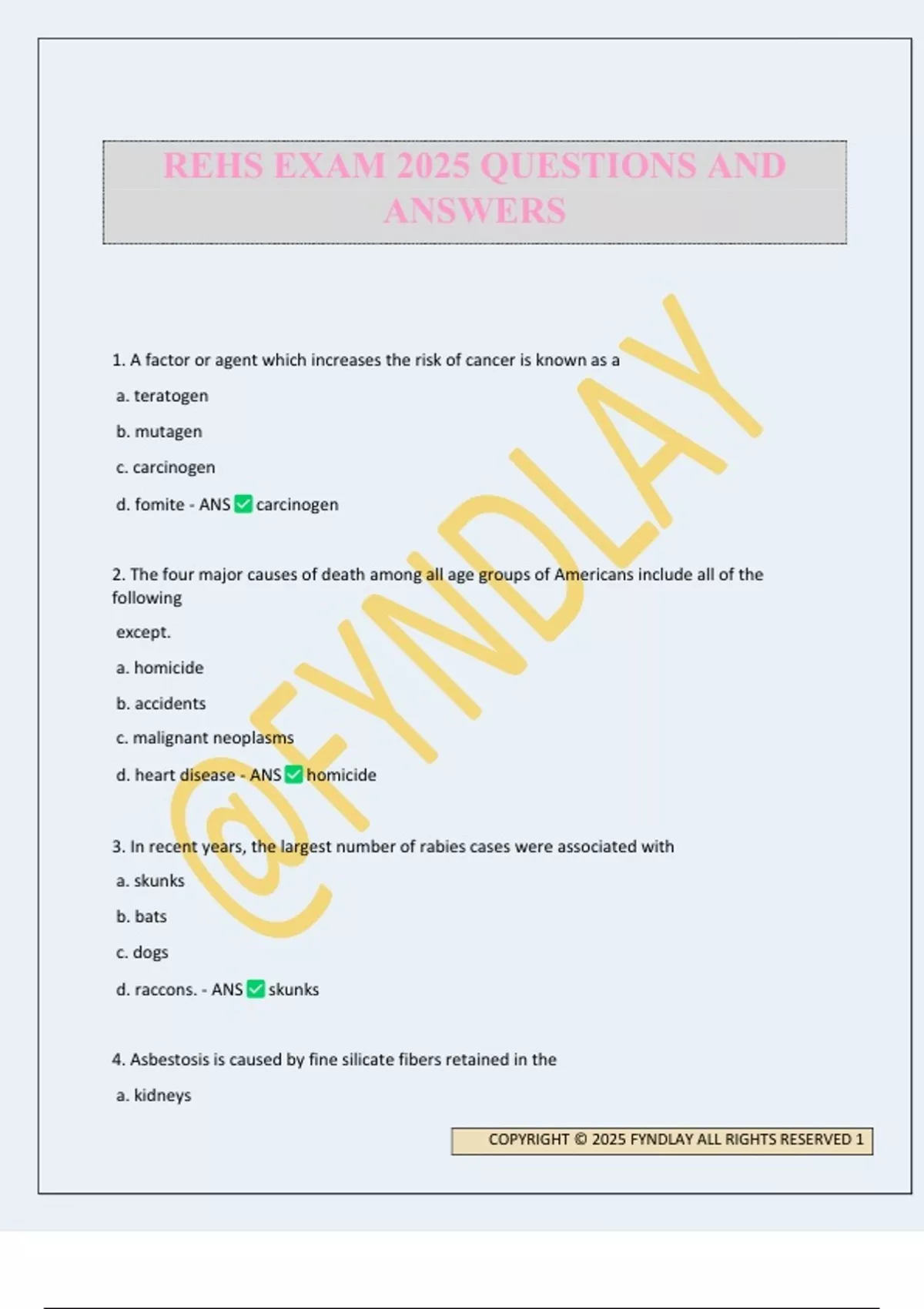 1. A factor or agent which increases the risk of cancer is known as a a. teratogen b. mutagen c. carcinogen d. fomite - ANS carcinogen 2. The four major causes of death among all age groups of Americans include all of the following except. a. homicide b. accidents c. malignant neoplasms d. heart disease - ANS homicide 3. In recent years, the largest number of rabies cases were associated with a. skunks b. bats c. dogs d. raccons. - ANS skunks 4. Asbestosis is caused by fine silicate fibers retained in the a. kidneys REHS EXAM 2025 QUESTIONS AND ANSWERS COPYRIGHT © 2025 FYNDLAY ALL RIGHTS RESERVED 2 b. lungs c. colon d. abdomen - ANS lungs 5. An illness due to a specific infectious agent or its toxic product which is transmitted from a reservoir to a susceptible host either directly or indirectly is called a. an infectious disease b. a communicable disease c. a genetic disease d. a noncommunicable disease - ANS a communicable disease 6. Rocky mountain spotted fever is spread by a. flies b. spiders c. cockroaches d. ticks - ANS ticks 7. Mycotoxins are poisonous chemicals produced by a. bacteria b. vertebrates c. viruses d. fungi - ANS fungi 8. The study of the occurrence, frequency, and distribution of disease is a. entomology b. biology c. endocrinology d. epidemiology - ANS epidemiology COPYRIGHT © 2025 FYNDLAY ALL RIGHTS RESERVED 3 9. Which of the following organisms are most resistant to unfavorable environmental conditions and indicate past or possibly intermittent pollution? a. fecal streptococci b. escherichia coli c. aerobacter aerogenes d. clostridium sporulates - ANS clostridium sporulates 10. Engineering controls are a. controls that isolate or remove hazards from the work place b. less effective than good training c. the last option that should be considered d. less effective than personal protection processes - ANS controls that isolate or remove hazards from the workplace 11. Which of the following is not considered a satisfactory solution to the problem of chemical contamination in Well systems? a. abandoning the well b. boiling the water c. building a new, properly constructed, drilled well - ANS boiling the water 12. Which of the following chemicals is most widely used to destroy microorganisms? a. chlorine b. copper sulfate c. chloramine d. hydrogen sulfate - ANS chlorine COPYRIGHT © 2025 FYNDLAY ALL RIGHTS RESERVED 4 13. Which of the following is not a practical method for removal of cadmium? a. ion exchange b. lime softening c. reverse osmosis d. iron coagulation - ANS reverse osmosis 14. Which of the following is not a commonly accepted method of device to prevent backsiphonage? a. vacuum breakers b. cross-connections c. air gap separation d. back pressure units - ANS cross-connections 15. This substance is the first product of the decomposition of organic matter. Its presence in water usually Indicates "fresh pollution" of sanitary significance. What is it? a. ammonia b. sugar c. carbon dioxide d. hydrogen sulfide - ANS ammonia 16. One of the most c