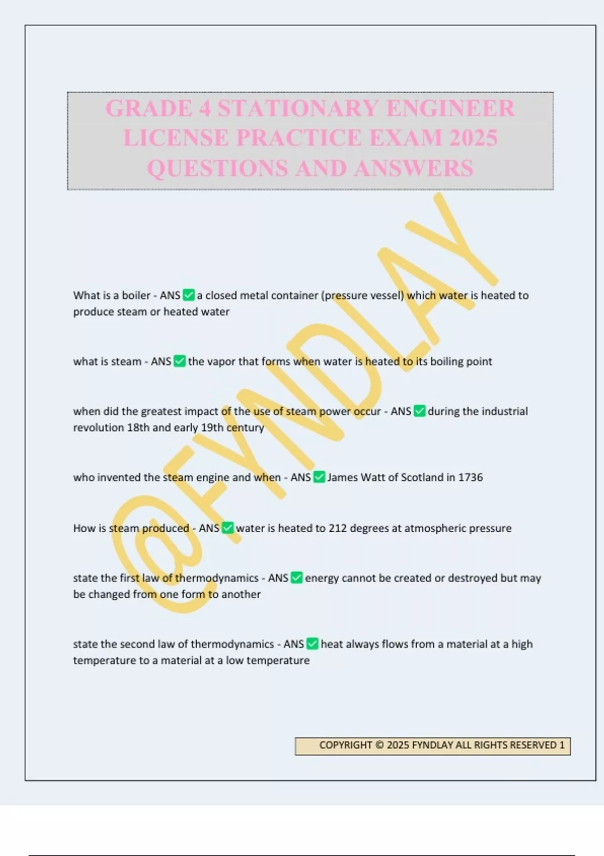 What is a boiler - ANS a closed metal container (pressure vessel) which water is heated to produce steam or heated water what is steam - ANS the vapor that forms when water is heated to its boiling point when did the greatest impact of the use of steam power occur - ANS during the industrial revolution 18th and early 19th century who invented the steam engine and when - ANS James Watt of Scotland in 1736 How is steam produced - ANS water is heated to 212 degrees at atmospheric pressure state the first law of thermodynamics - ANS energy cannot be created or destroyed but may be changed from one form to another state the second law of thermodynamics - ANS heat always flows from a material at a high temperature to a material at a low temperature GRADE 4 STATIONARY ENGINEER LICENSE PRACTICE EXAM 2025 QUESTIONS AND ANSWERS COPYRIGHT © 2025 FYNDLAY ALL RIGHTS RESERVED 2 what is sensible heat - ANS heat that causes a temperature change that can be measured with a thermometer or sensed by a person what is latent heat - ANS head identified by a change of state and no temperature change what is a BTU - ANS the amount of energy required to raise the temperature of 1 lb of water 1 degree fahrenheit name 3 ways heat is transferred - ANS conduction, convection, and radiation How is heat generated in a boiler - ANS by the combustion of a fuel name the 3 conditions of combustion - ANS perfect, complete. or incomplete name the 3 classifications of combustion air - ANS primary air, secondary air, and excess air describe the 4 systems all steam boilers operate using - ANS feedwater system, fuel system, draft system, and steam system what does the feedwater system do? - ANS supplies the proper amount of water to the boiler what does the draft system regulate? - ANS the flow of air to and from the boiler what does the fuel system do - ANS provides fuel for combustion to generate the necessary heat in the boiler