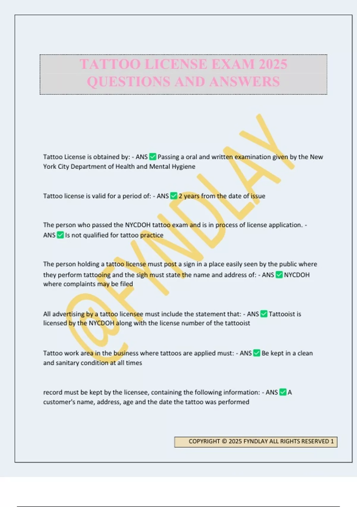 TATTOO LICENSE EXAM 2025 QUESTIONS AND ANSWERS