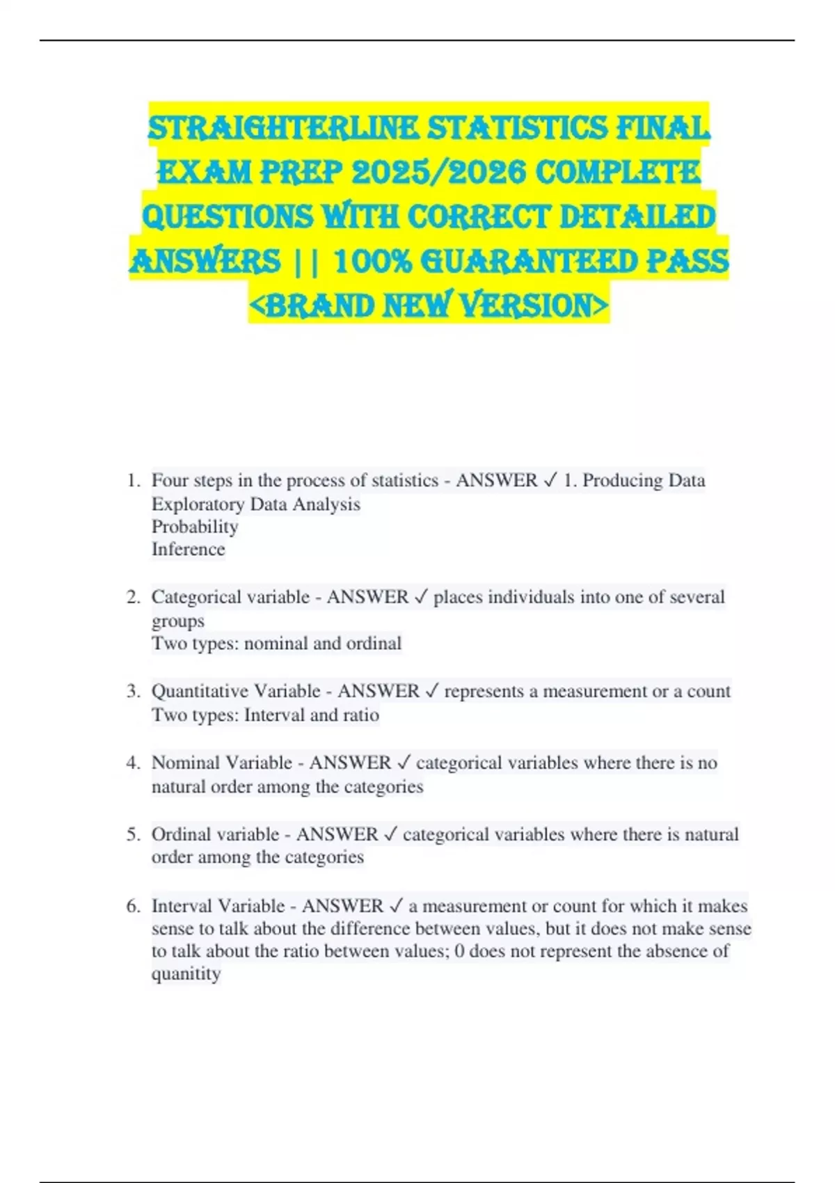 Straighterline Statistics FINAL EXAM PREP 2025/2026 COMPLETE QUESTIONS WITH CORRECT DETAILED ANSWERS || 100% GUARANTEED PASS &lt;BRAND NEW VERSION&gt; 1. Four steps in the process of statistics - ANSWER 1. Producing Data Exploratory Data Analysis Probability Inference 2. Categorical variable - ANSWER places individuals into one of several groups Two types: nominal and ordinal 3. Quantitative Variable - ANSWER represents a measurement or a count Two types: Interval and ratio 4. Nominal Variable - ANSWER categorical variables where there is no natural order among the categories 5. Ordinal variable - ANSWER categorical variables where there is natural order among the categories 6. Interval Variable - ANSWER a measurement or count for which it makes sense to talk about the difference between values, but it does not make sense to talk about the ratio between values; 0 does not represent the absence of quanitity 7. Ratio Variable - ANSWER quantitative variables for which it makes sense to talk about the difference between values AND the ratio between values; 0 represents the absence of quantity 8. Standard Deviation Rule - ANSWER Approximately 68% of observations fall within 1 sd of the mean, 95% within 2 sd, 99.7% (or virtually all) within 3 sds 9. Interquartile Range (IQR) - ANSWER Middle 50% of the data IQR= Q3-Q1 10. Finding an outlier using IQR - ANSWER An observation is considered a suspected outlier if it is: less than Q1 - 1.5(IQR), or more than Q3 + 1.5(IQR). 11. Interpreting scatterplots: 1. positive relationship displays as 2. negative relationship displays as - ANSWER 1. upward slope 3. downward slope 12. Interpreting Scatterplots: How to tell if a linear relationship is strong or weak - ANSWER closer to -1 is a strong negative linear relationship closer to +1 is a strong positive linear relationship close to 0 is a weak linear relationship 13. Interpreting Scatterplots: Linear regression - ANSWER Finding the line that best fits the pattern of the linear relationship (the line that describes how the response variable linearly depends on the explanatory variable 14. Interpreting Scatterplots: Least Squares Regression Line - ANSWER Has the smallest sum of squared vertical deviations of the data points from the line. 15. Interpreting Scatterplots: Extrapolation - ANSWER Prediction for ranges of the explanatory variable that are not in the data; is not reliable and should be avoided 16. Association (does/does not) imply causation. - ANSWER Does not 17. Lurking Variable - ANSWER a variable that is not among the explanatory or response variables in a study, but could substantially affect your interpretation of the relationship among those variables 18. Simpson's paradox - ANSWER When a lurking variable causes you to rethink the direction of an association 19. Probability sampling plan - ANSWER any sampling plan that relies on random selection (avoids bias). 20. Simple Random Sampling - ANSWER Every member of the population has an equal probability of being selected for the sample 21. Cluster Sampling - ANSWER Used when the population is naturally divided into groups. Take a random sample of clusters and use all individuals within those clusters as the sample. 22. Stratified sampling - ANSWER Used when the population is naturally divided into sub-populations called stratum. Choose a simple random sample from each stratum and use these together as the sample. 23. Multistage sampling - ANSWER a probability sampling technique involving at least two stages: a random sample of clusters followed by a random sample of people within the selected clusters 24. Observational study - ANSWER values of the variable or variables of interest are recorded as they naturally occur; no interference 25. Sample surveys - ANSWER a particular type of observational study in which individuals report variables' values themselves, frequently by giving their opinions. 26. The main score on a college entrance exam is 1200, and the standard deviation is 100. If the scores are normally distributed, what is the likelihood of the score greater than 1450? - ANSWER 0.0062 27. What type of distribution is depicted in the graph? - ANSWER Normal 28. A school gives an exam for which the scores are normally distributed. What proportion of students score within 2.3 standard deviations of the mean? - ANSWER 0.98 29. The mean score for 18 holes of golf on the parkvale municipal course is 68, with a standard deviation of 12. Low score is 95. What is Z - score does this correspond to? - ANSWER 2.25 30. Damien determines that the difference is he found in his study are statistically significant at the 0.05 level of significance. What is the correct interpretation of the finding? - ANSWER 95% of the study participants achieve the level of performance expected 31. The central limit theorem says that if the sample size doubles, the sampling distribution of the sample mean will - ANSWER Approach a normal distribution 32. Scores on a certain standard achievement test are normally distributed with mean μ = 100 and standard deviation σ= 10. If you take multiple samples of size 16, what percent of sample of means will be between 95 and 105. - ANSWER 95.4% 33. A student performed a chi square test with 5° of freedom. What would be the critical value of the chi square statistic, assuming a significance level of P&lt; 0.05 - ANSWER 11.07 34. Withdrawn from a normal distribution, 95% of the sample means will fall within how many standard deviations of the population - ANSWER 1.96 35. A maple syrup manufacturer asked 100 customers to rate its brand of maple syrup on a scale of one to 10. The mean rating was seven, with a sample standard deviation of 1.5. Based on this sample, what is the 95% confidence interval for the estimate of the population mean? - ANSWER (6.7, 7.3) 36. A regression analysis suggest that the number of children and employee has predicts the number of personal days he/she will take off work. The life of the regression line i