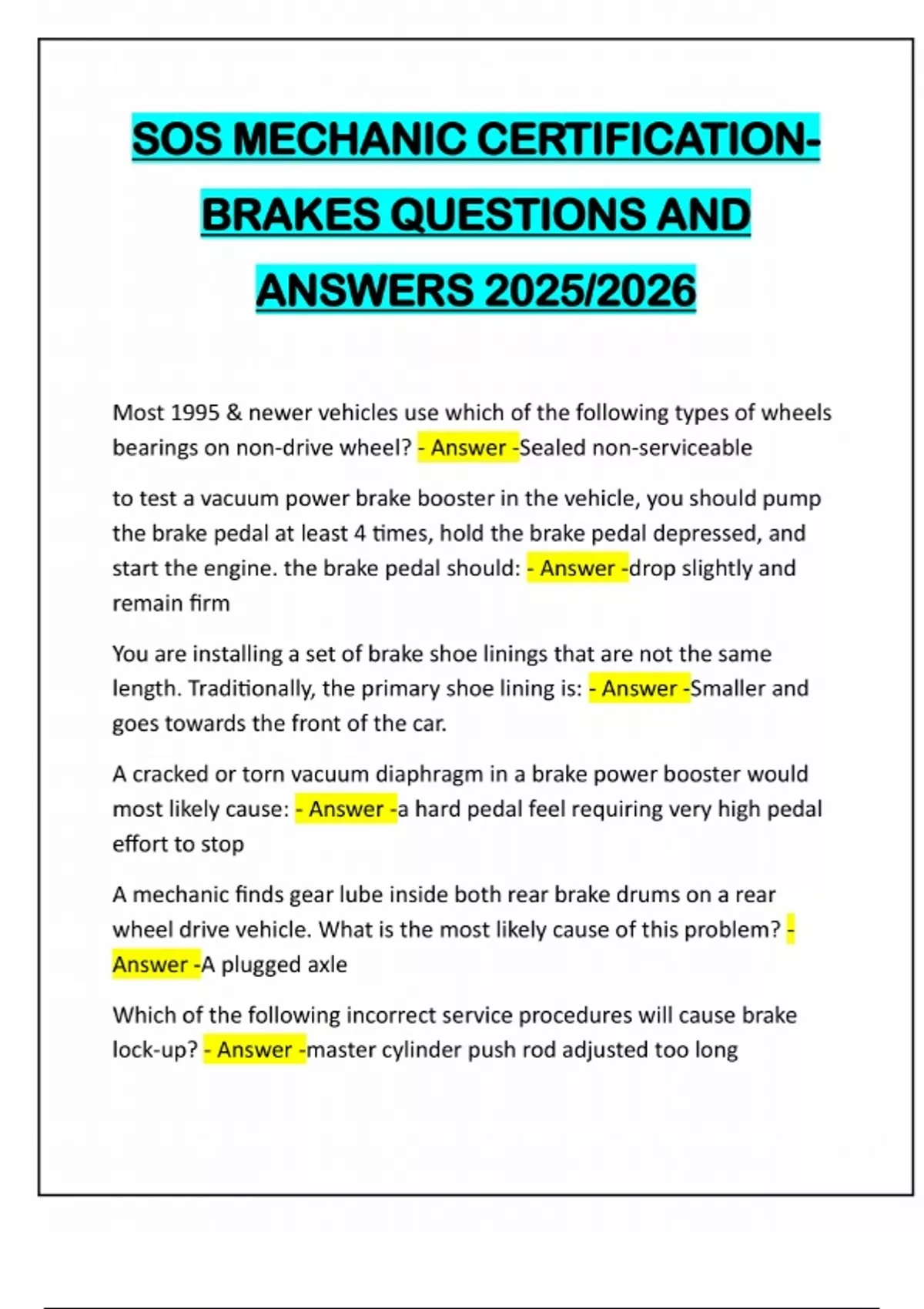 SOS MECHANIC CERTIFICATIONBRAKES QUESTIONS AND ANSWERS 2025/2026 Most 1995 & newer vehicles use which of the following types of wheels bearings on non-drive wheel? - Answer -Sealed non-serviceable to test a vacuum power brake booster in the vehicle, you should pump the brake pedal at least 4 times, hold the brake pedal depressed, and start the engine. the brake pedal should: - Answer -drop slightly and remain firm You are installing a set of brake shoe linings that are not the same length. Traditionally, the primary shoe lining is: - Answer -Smaller and goes towards the front of the car. A cracked or torn vacuum diaphragm in a brake power booster would most likely cause: - Answer -a hard pedal feel requiring very high pedal effort to stop A mechanic finds gear lube inside both rear brake drums on a rear wheel drive vehicle. What is the most likely cause of this problem? - Answer -A plugged axle Which of the following incorrect service procedures will cause brake lock-up? - Answer -master cylinder push rod adjusted too longWhich of the following describes the proper way to depressurized an ABS system? - Answer -Pump the brake pedal at least 25 times (or more, depending on the manufacturer's recommendation) with the ignition off. The rear brakes are dragging after having new linings installed and the drums machined. the most likely cause is the: - Answer -technician use the parking brake to adjust shoes and the cable is stuck When turning brake drums: - Answer -use a dampening strap to reduce chatter Which of the following is NOT a necessary drum brake measurement? - Answer -run-out On a 3-channel system, which wheels are on the same circuit? - Answer -both rear wheels One way to test an ABS wheel speed signal is to use _____ on your digital multimeter. - Answer -AC volts The key input for the ABS control module comes from the: - Answer - wheel speed sensors ABS speed sensor and sensor rings: - Answer -should not be hammered or tapped on and should always be replaced as a matched set Flexible brake hoses should be replaced: - Answer -when da
